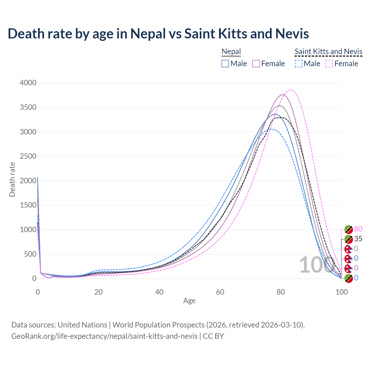 In Nepal, the most common age of death is 80, compared to 80 in Saint Kitts and Nevis. The median age of death is 75.4 in Nepal and 76.3 in Saint Kitts and Nevis, meaning only half of each cohort is expected to live past that age.