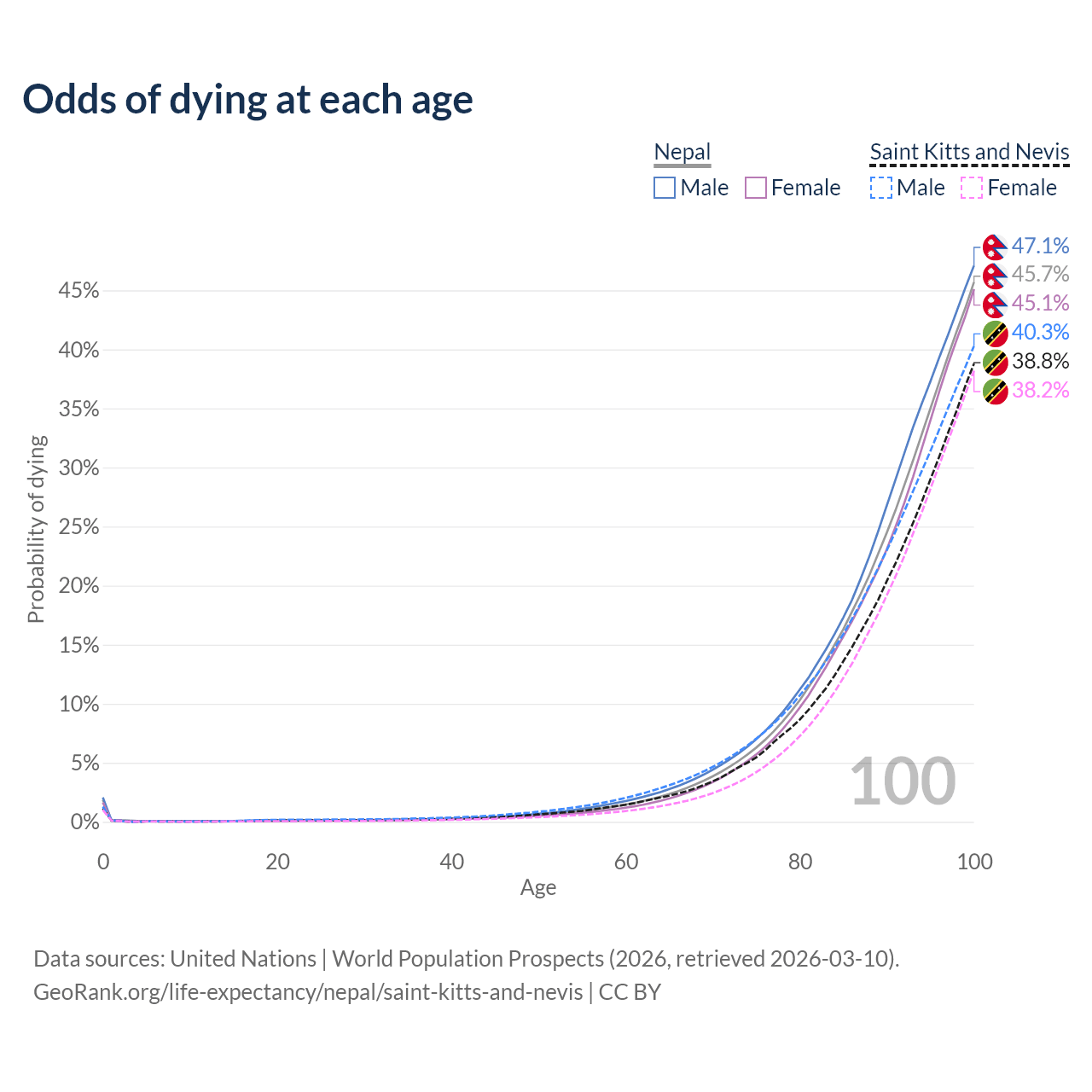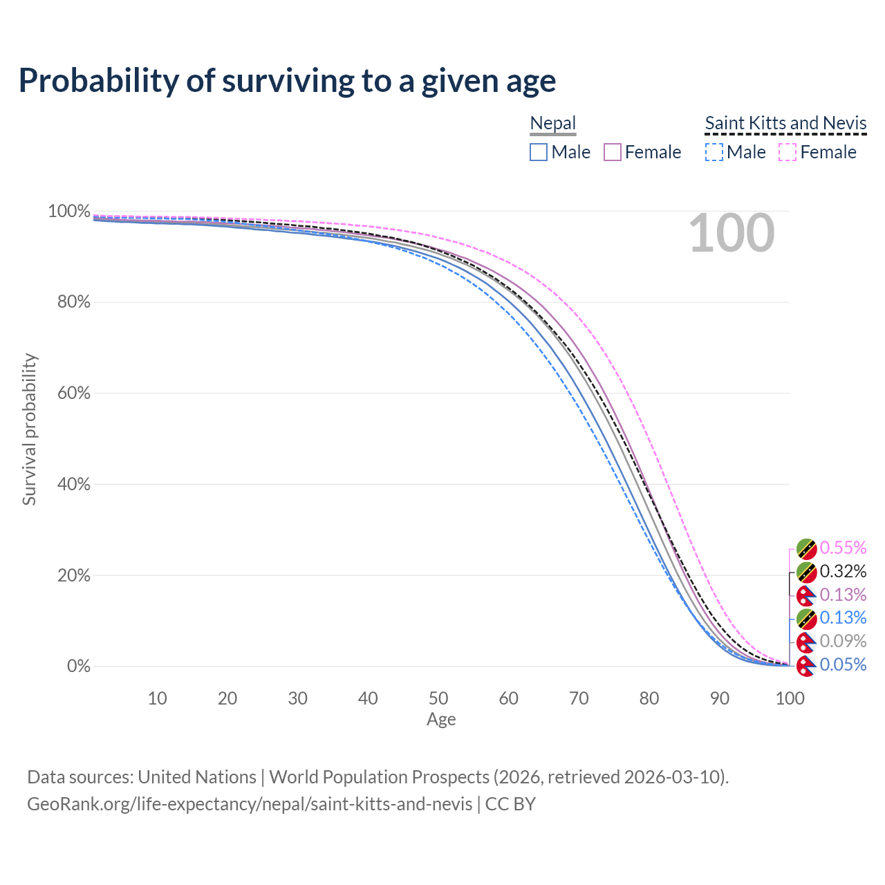 This life expectancy calculator shows the odds of living to 100, 95, 90, and below based on current age for both males and females in Nepal and Saint Kitts and Nevis, along with mean and median age of death. The calculations are based on the 2026 life tables (actuarial tables) from the UN World Population Prospects.
