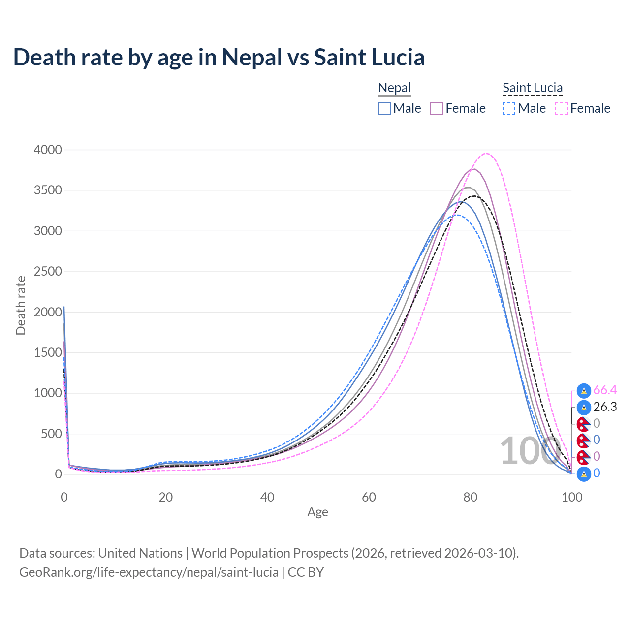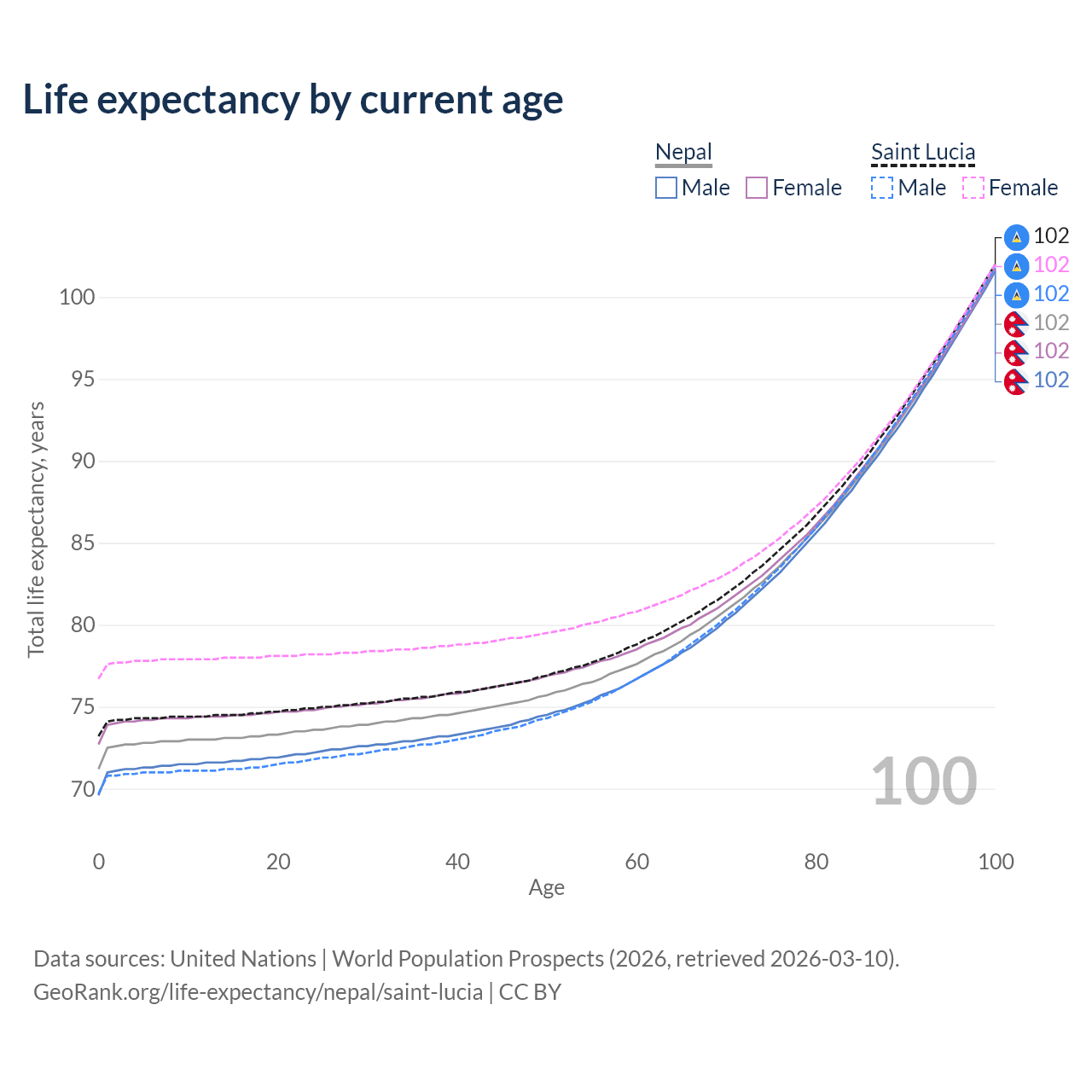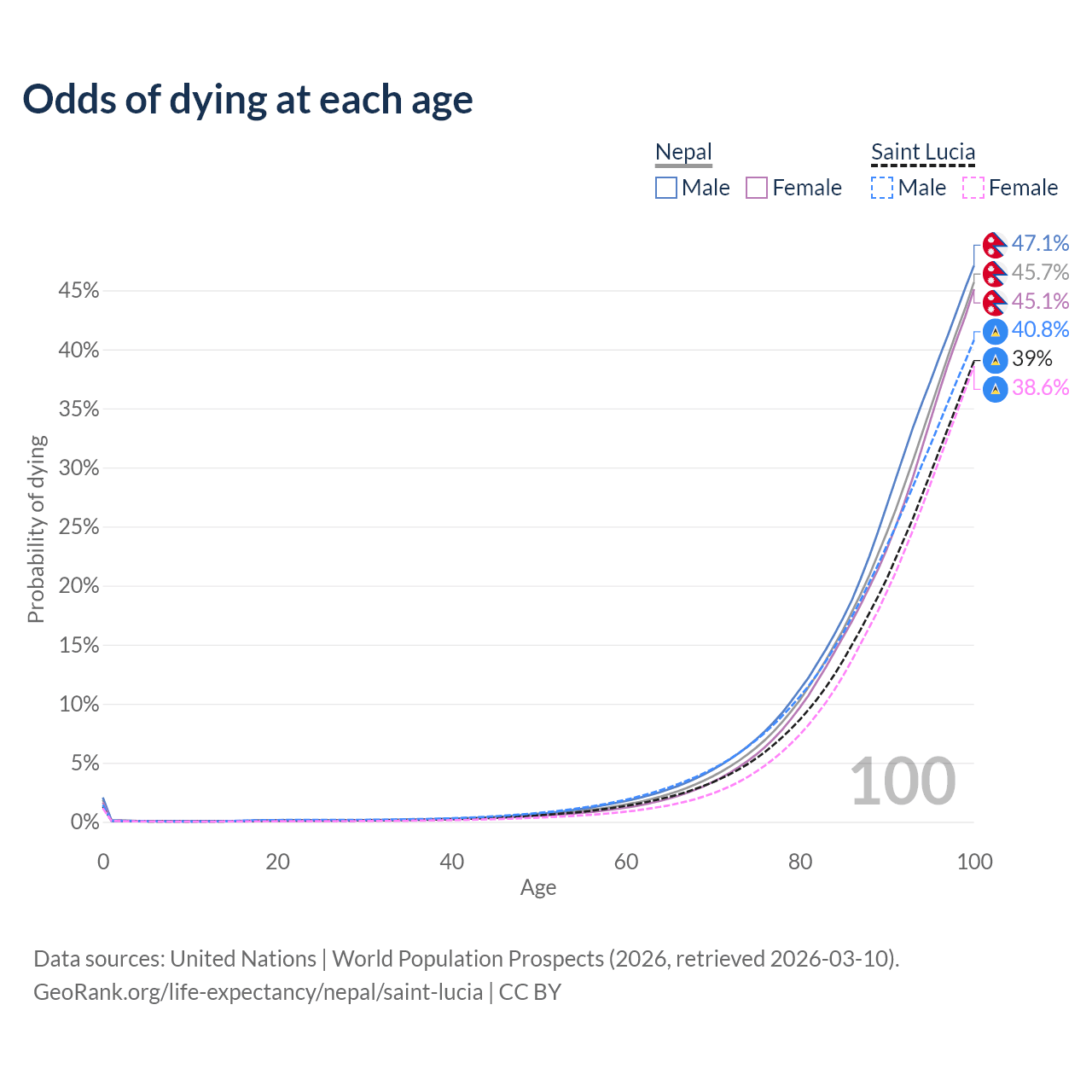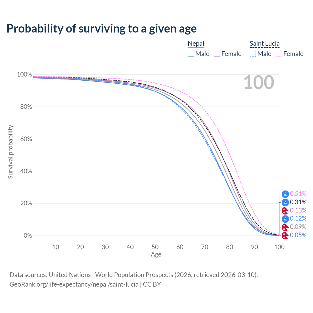 This life expectancy calculator shows the odds of living to 100, 95, 90, and below based on current age for both males and females in Nepal and Saint Lucia, along with mean and median age of death. The calculations are based on the 2026 life tables (actuarial tables) from the UN World Population Prospects.