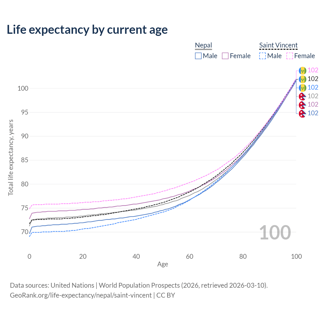 This life expectancy calculator shows the odds of living to 100, 95, 90, and below based on current age for both males and females in Nepal and Saint Vincent, along with mean and median age of death. The calculations are based on the 2026 life tables (actuarial tables) from the UN World Population Prospects.
