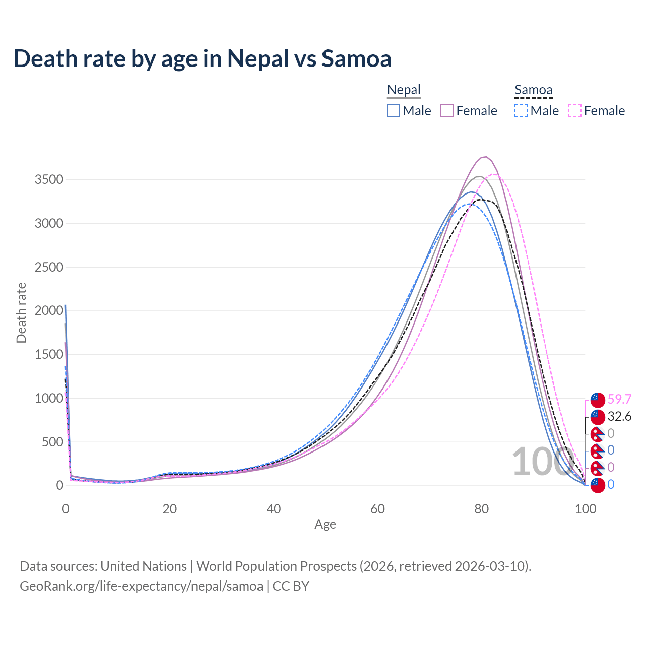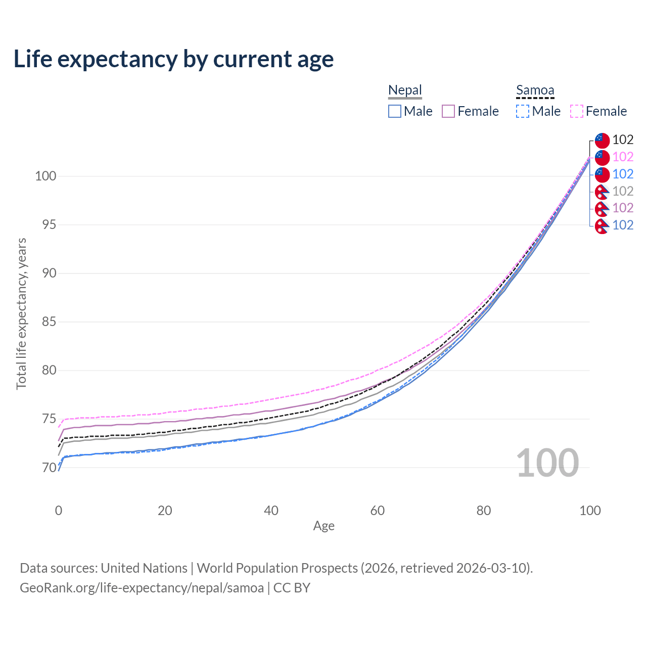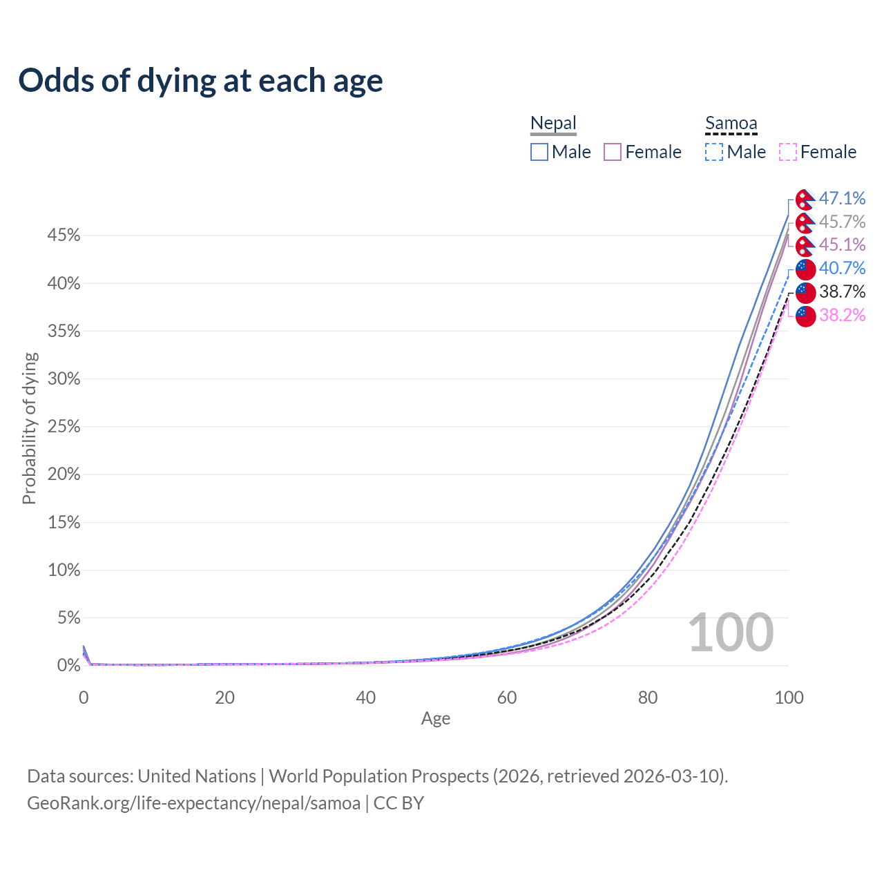 This life expectancy calculator shows the odds of living to 100, 95, 90, and below based on current age for both males and females in Nepal and Samoa, along with mean and median age of death. The calculations are based on the 2026 life tables (actuarial tables) from the UN World Population Prospects.