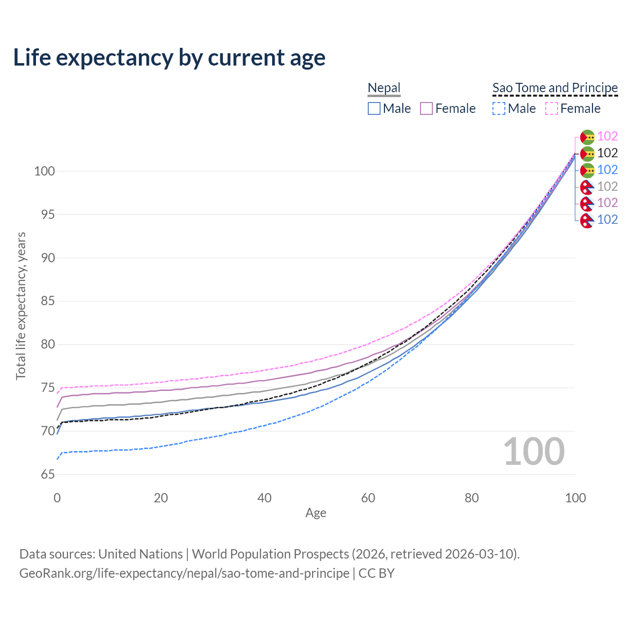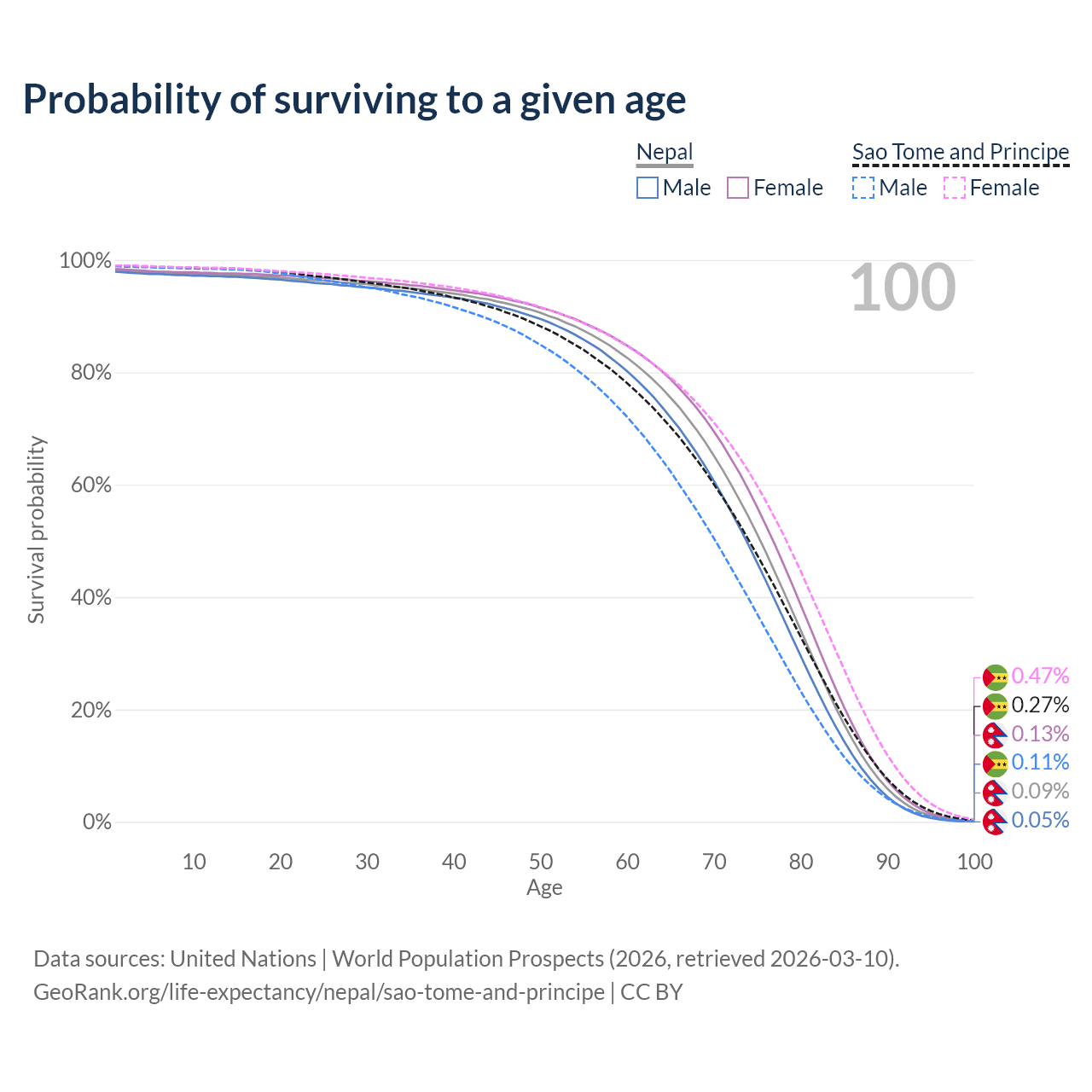 This life expectancy calculator shows the odds of living to 100, 95, 90, and below based on current age for both males and females in Nepal and Sao Tome and Principe, along with mean and median age of death. The calculations are based on the 2026 life tables (actuarial tables) from the UN World Population Prospects.