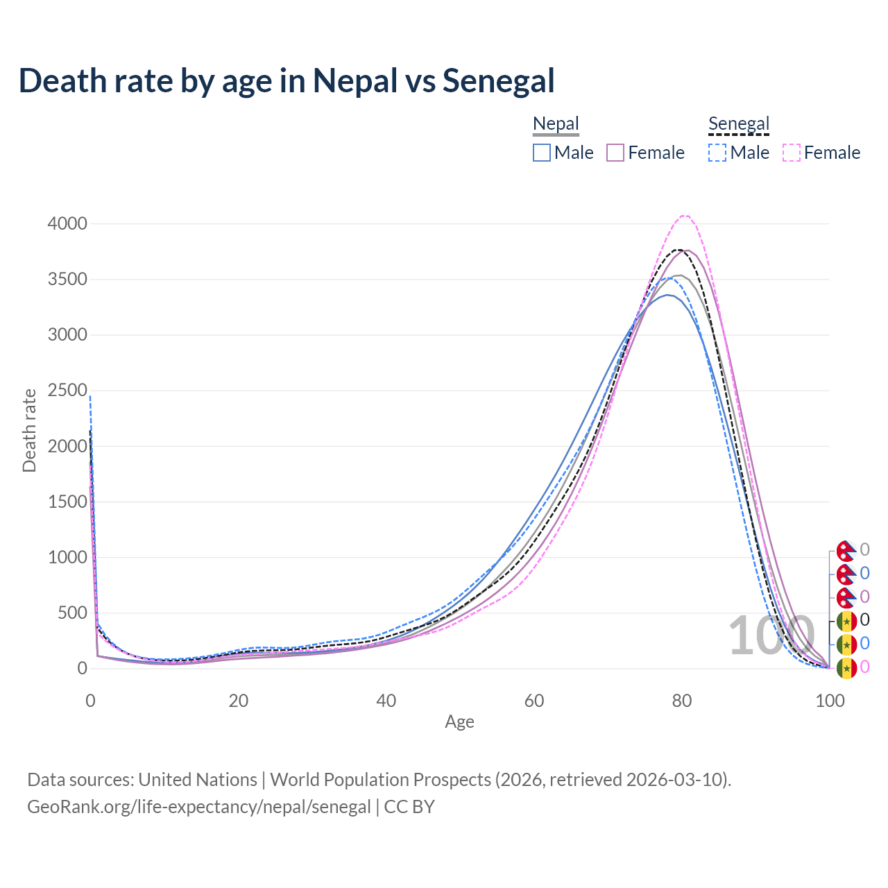 In Nepal, the most common age of death is 80, compared to 80 in Senegal. The median age of death is 75.4 in Nepal and 75 in Senegal, meaning only half of each cohort is expected to live past that age.