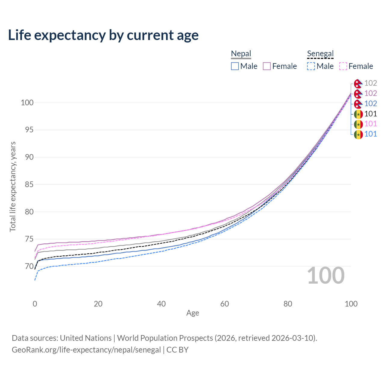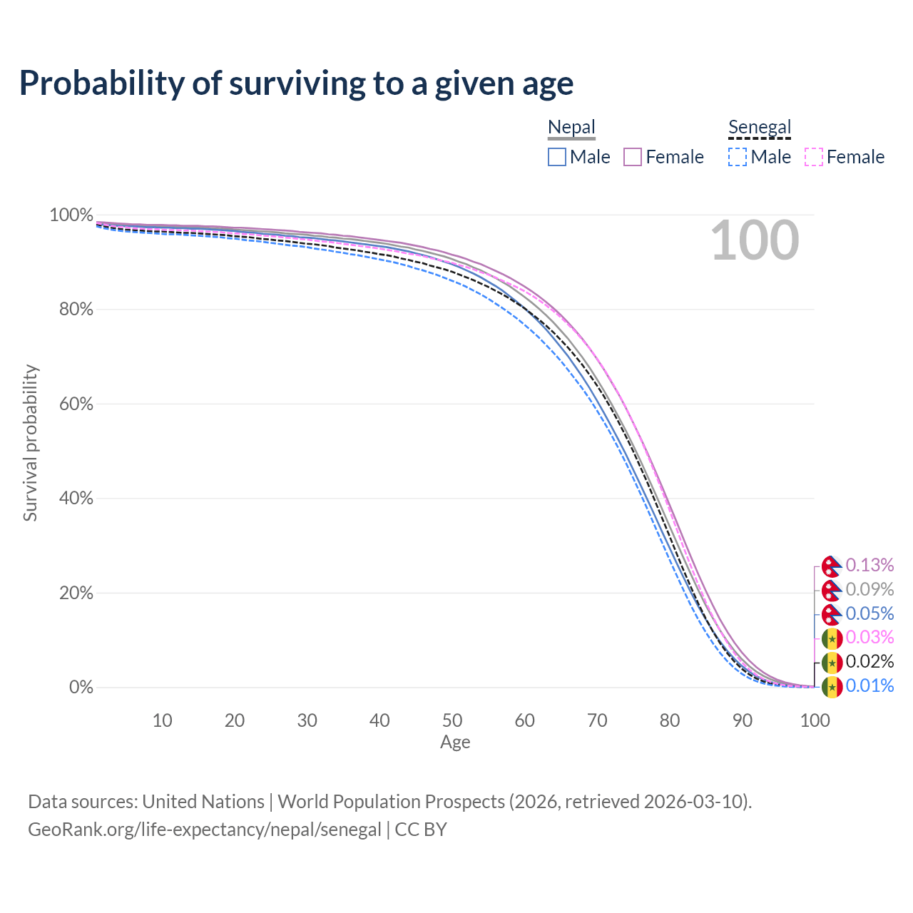This life expectancy calculator shows the odds of living to 100, 95, 90, and below based on current age for both males and females in Nepal and Senegal, along with mean and median age of death. The calculations are based on the 2026 life tables (actuarial tables) from the UN World Population Prospects.