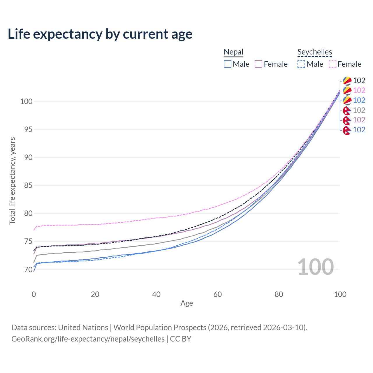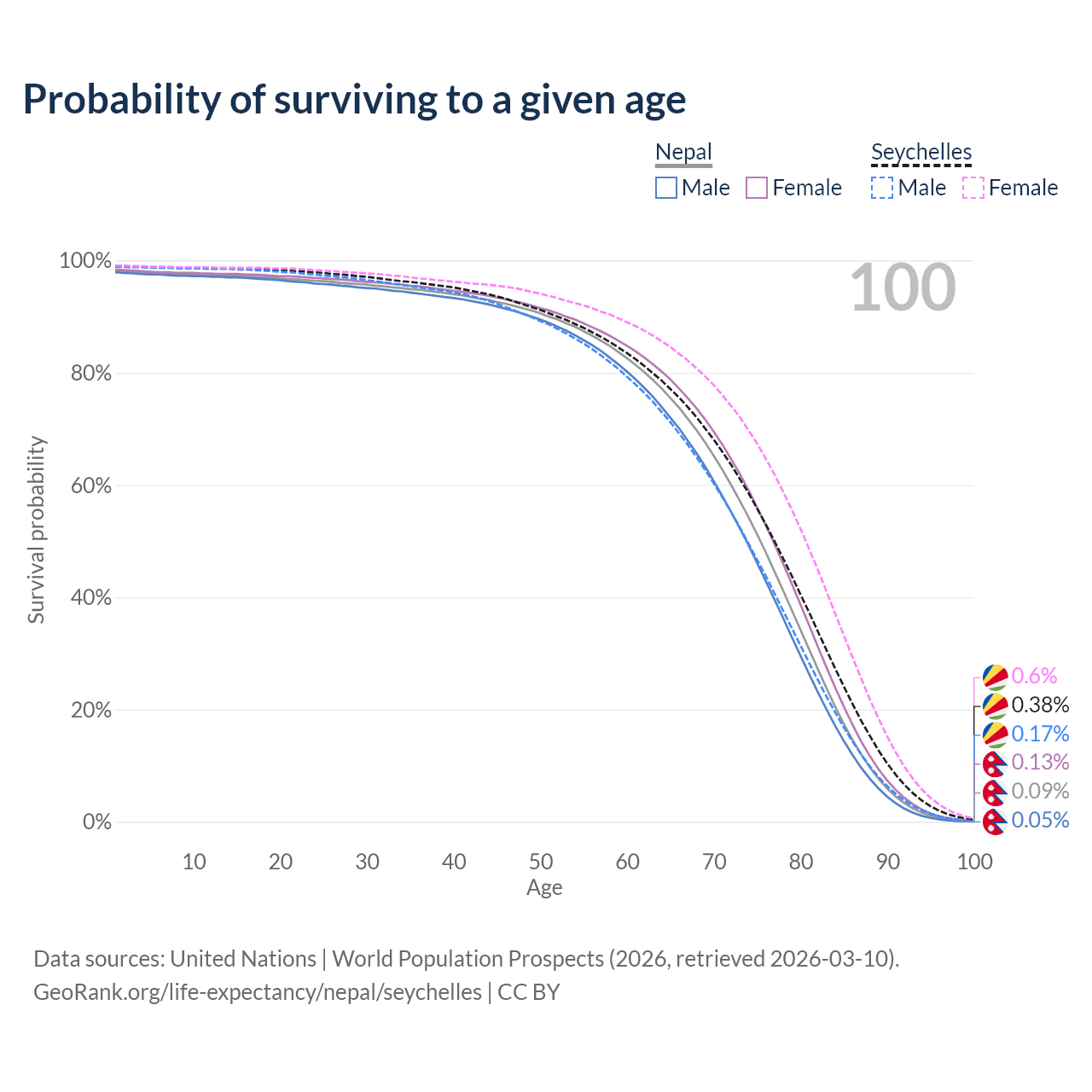 This life expectancy calculator shows the odds of living to 100, 95, 90, and below based on current age for both males and females in Nepal and the Seychelles, along with mean and median age of death. The calculations are based on the 2026 life tables (actuarial tables) from the UN World Population Prospects.