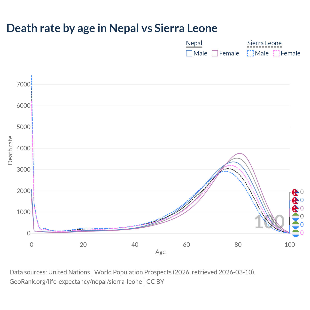 In Nepal, the most common age of death is 80, compared to 0 in Sierra Leone. The median age of death is 75.4 in Nepal and 70.8 in Sierra Leone, meaning only half of each cohort is expected to live past that age.