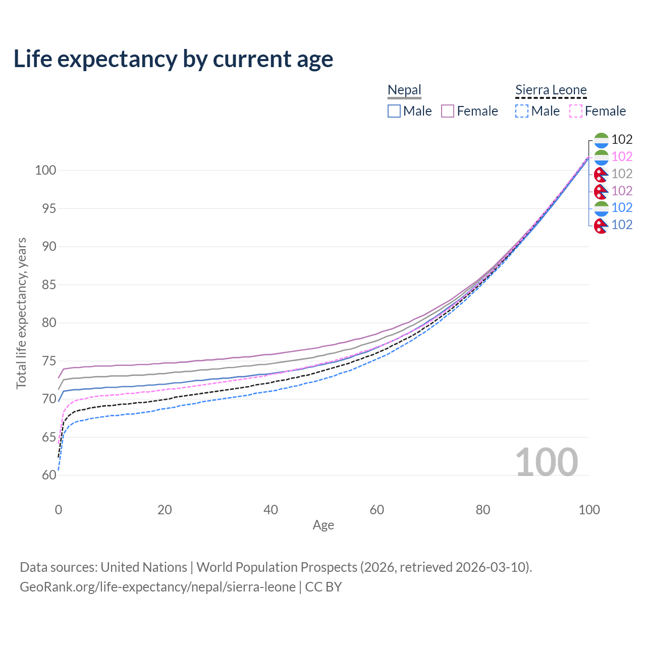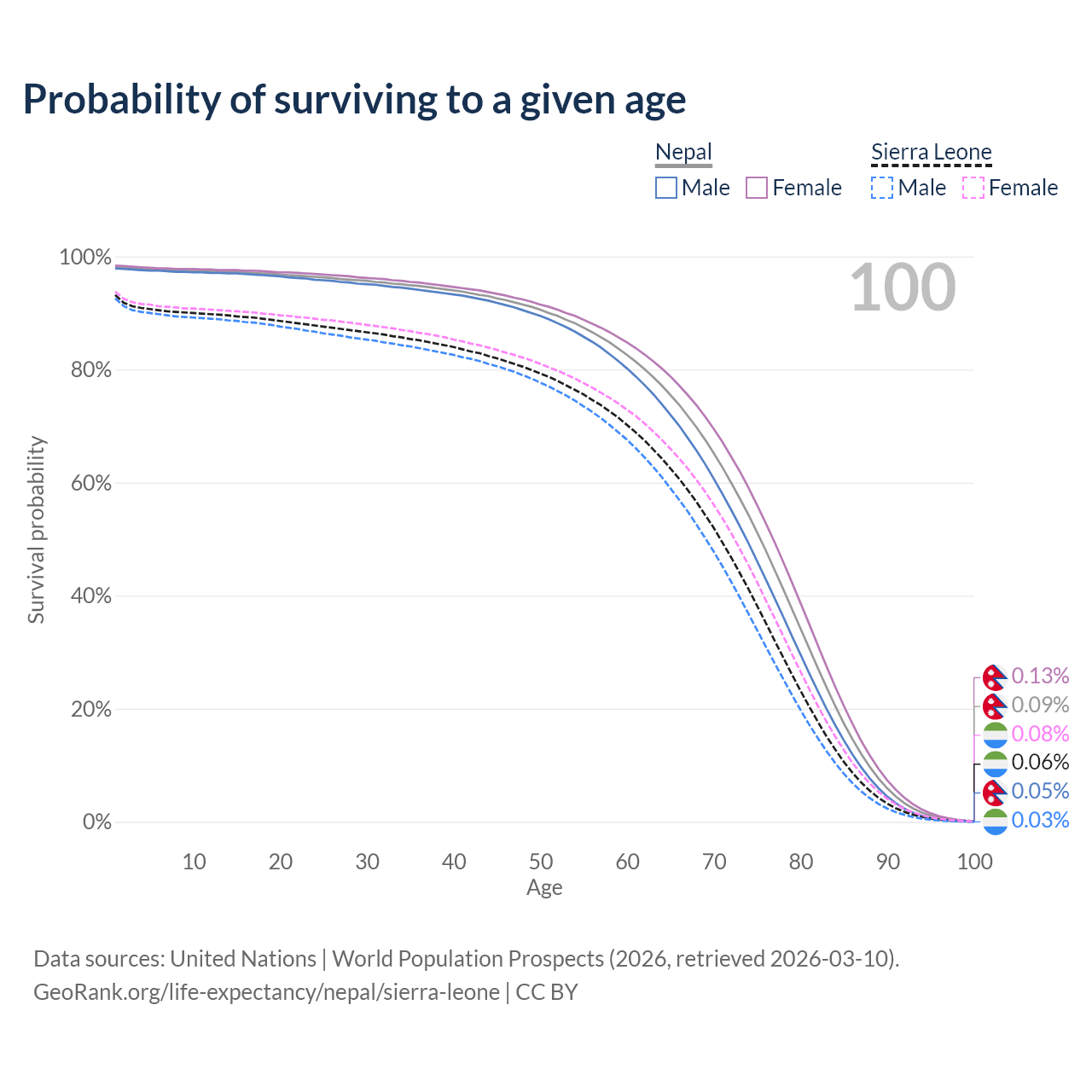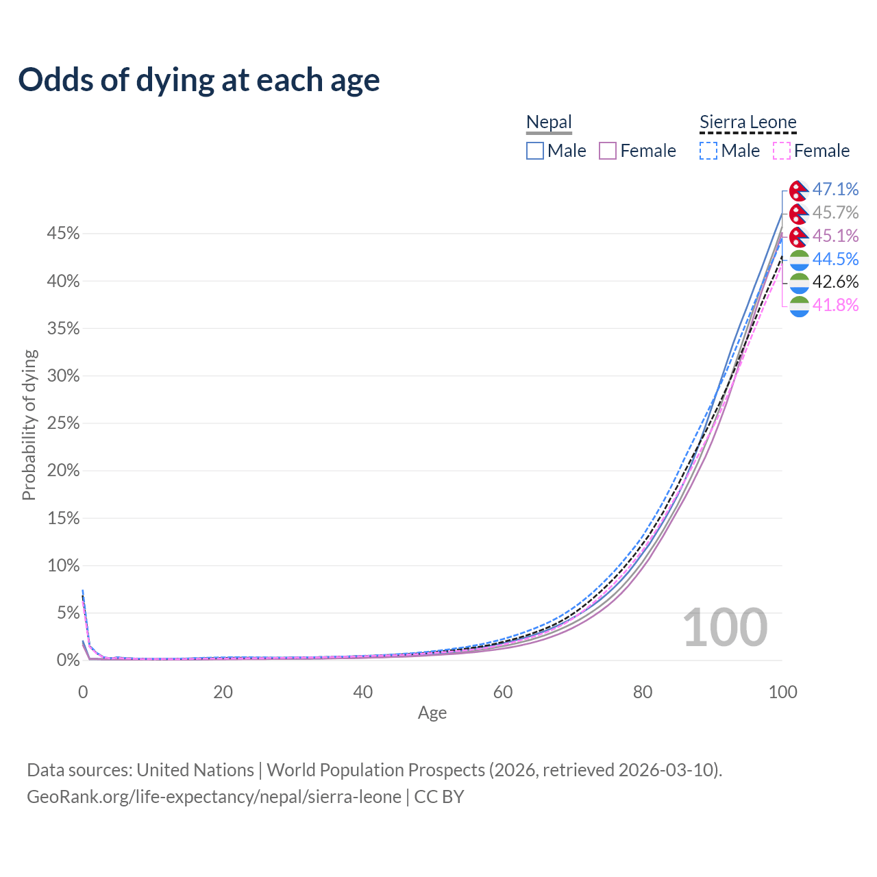 This life expectancy calculator shows the odds of living to 100, 95, 90, and below based on current age for both males and females in Nepal and Sierra Leone, along with mean and median age of death. The calculations are based on the 2026 life tables (actuarial tables) from the UN World Population Prospects.