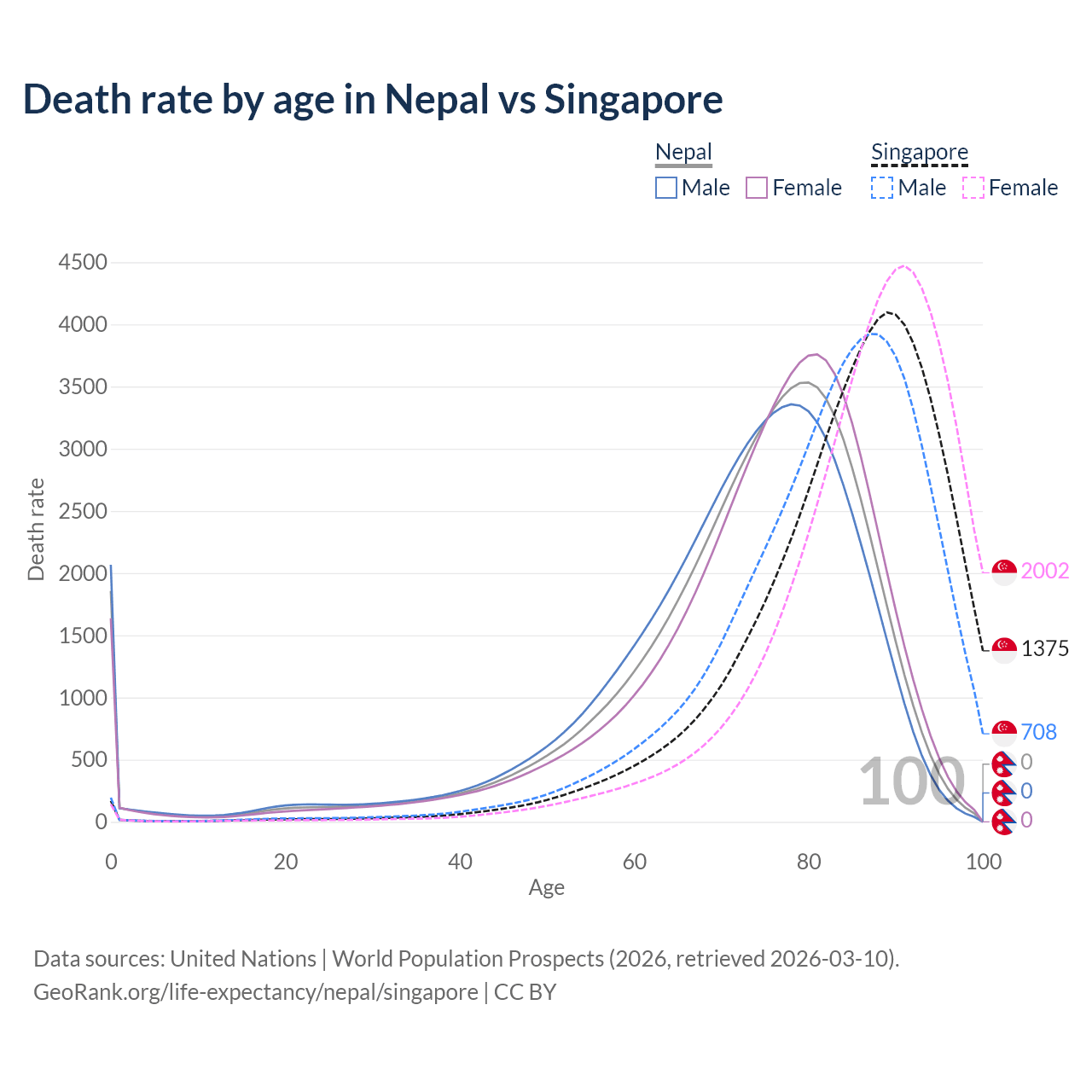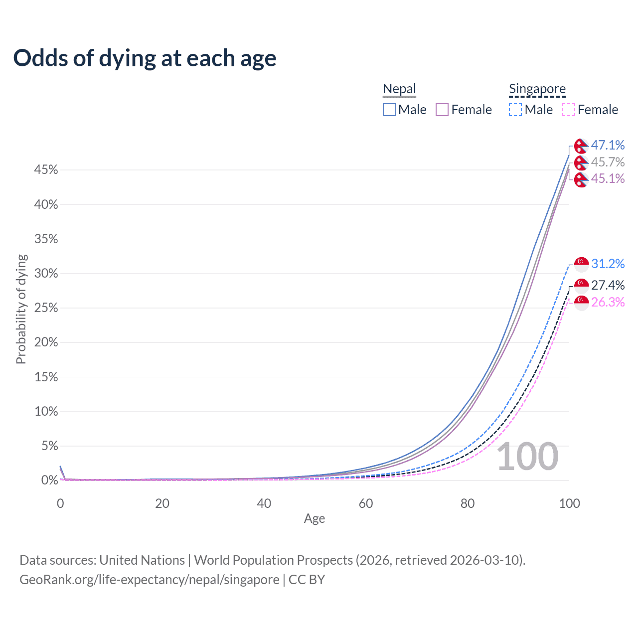 This life expectancy calculator shows the odds of living to 100, 95, 90, and below based on current age for both males and females in Nepal and Singapore, along with mean and median age of death. The calculations are based on the 2026 life tables (actuarial tables) from the UN World Population Prospects.