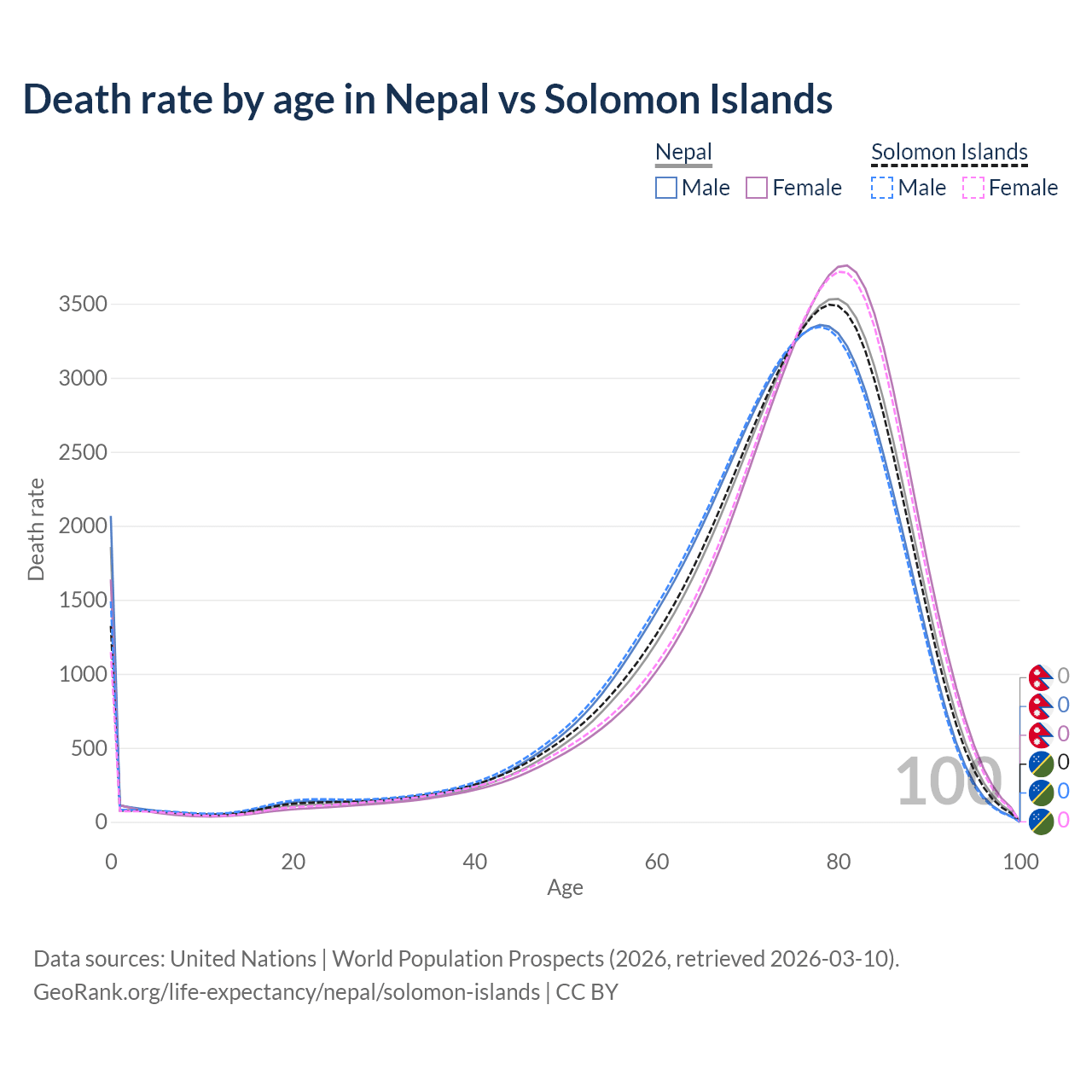 In Nepal, the most common age of death is 80, compared to 79 in the Solomon Islands. The median age of death is 75.4 in Nepal and 74.9 in the Solomon Islands, meaning only half of each cohort is expected to live past that age.