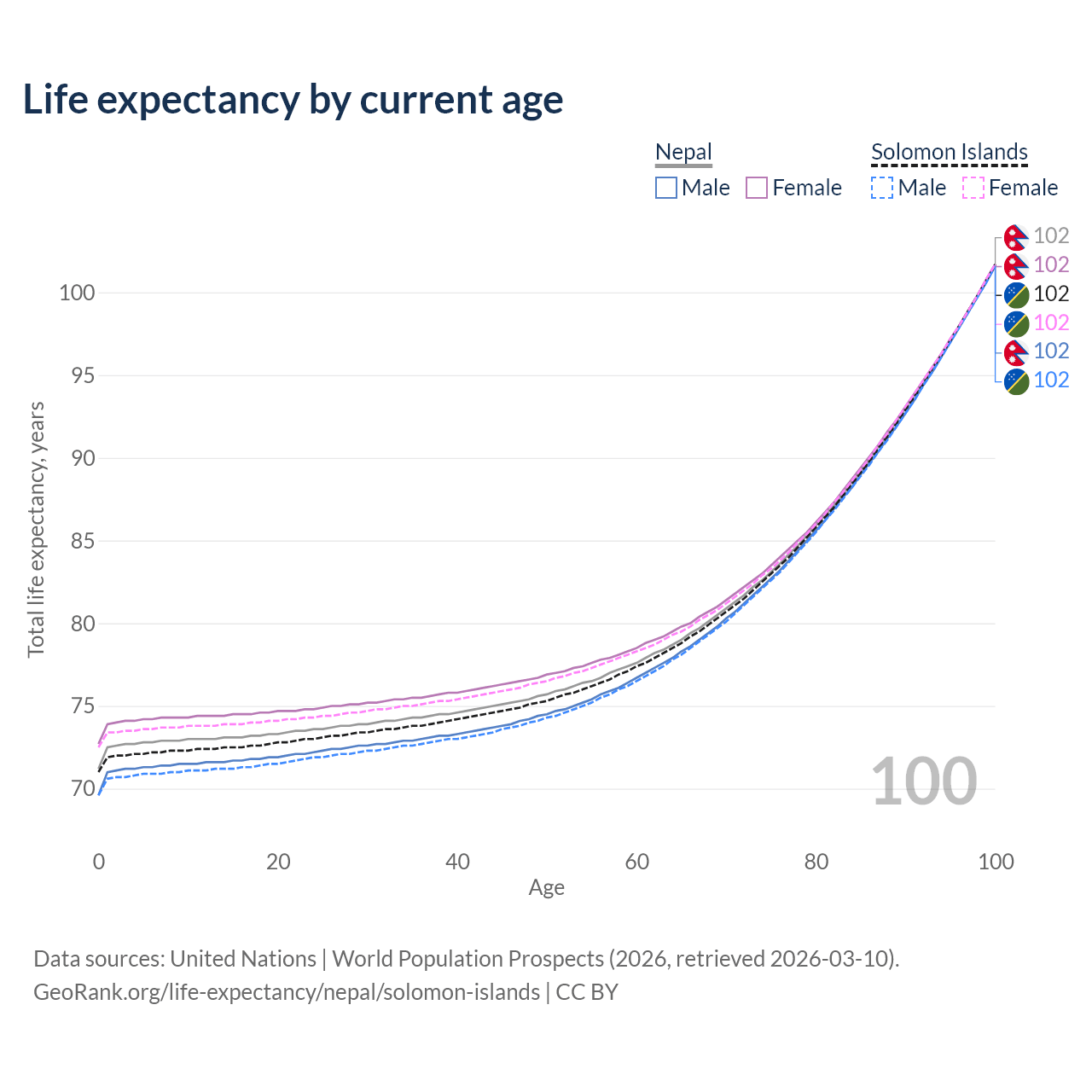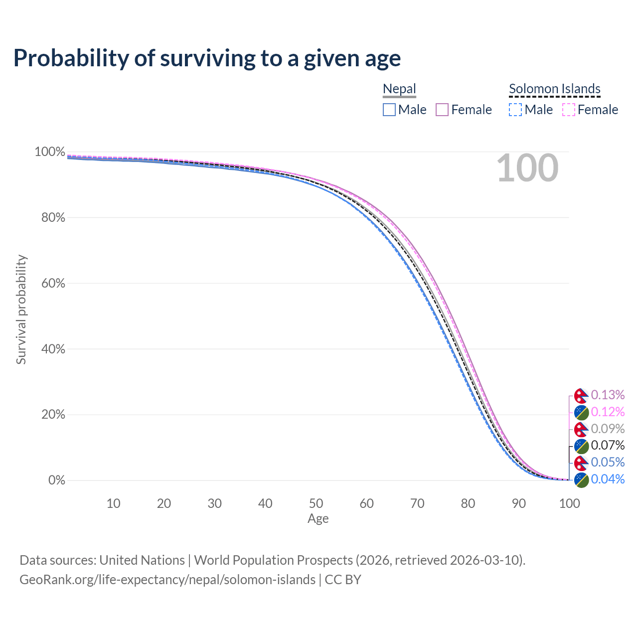 This life expectancy calculator shows the odds of living to 100, 95, 90, and below based on current age for both males and females in Nepal and the Solomon Islands, along with mean and median age of death. The calculations are based on the 2026 life tables (actuarial tables) from the UN World Population Prospects.