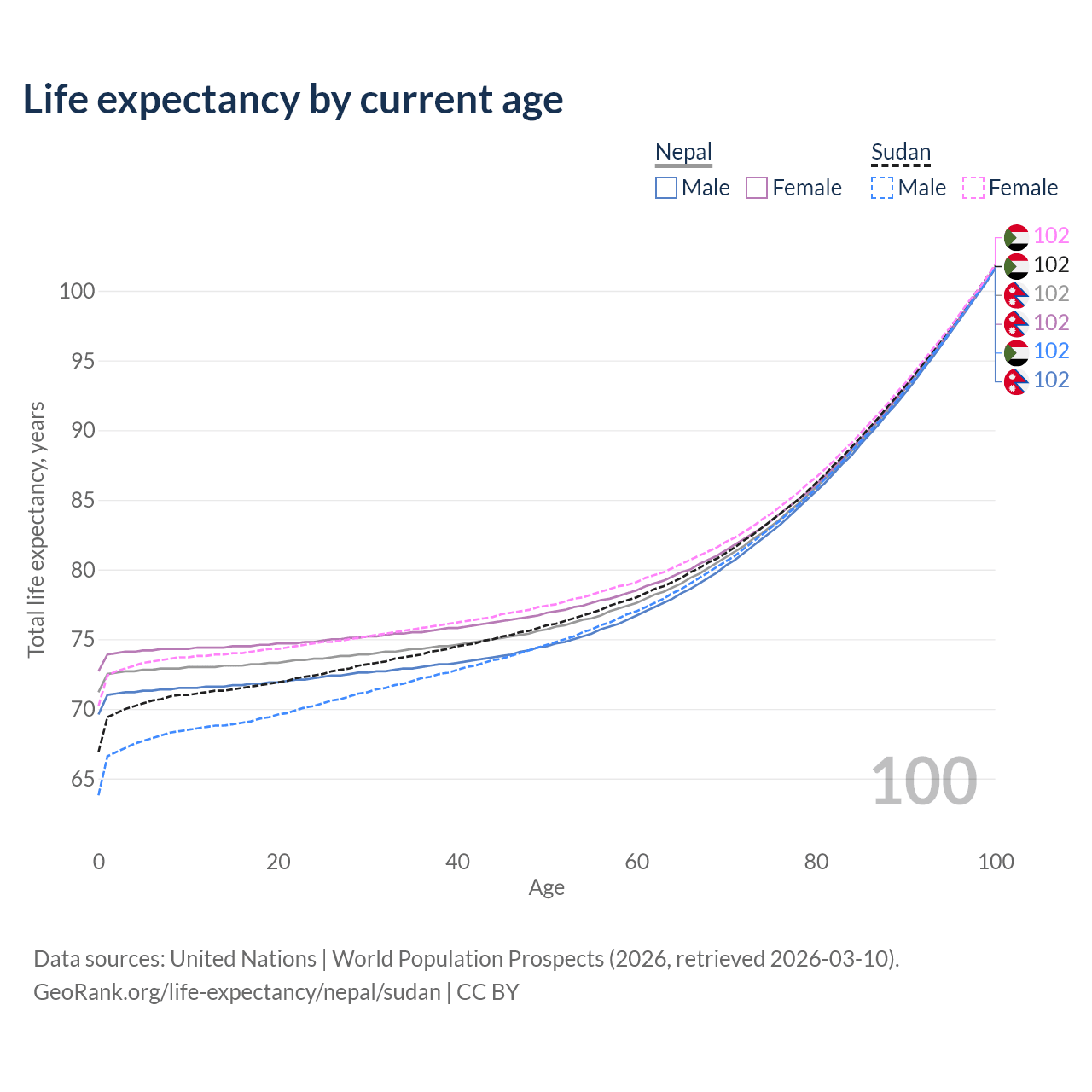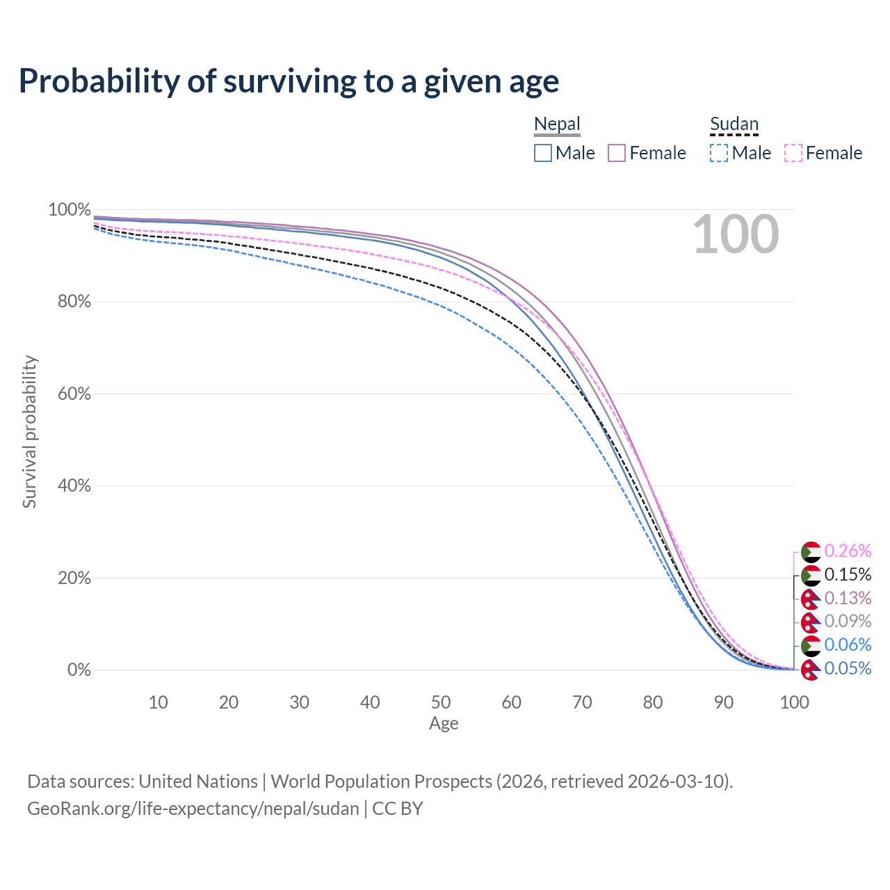 This life expectancy calculator shows the odds of living to 100, 95, 90, and below based on current age for both males and females in Nepal and Sudan, along with mean and median age of death. The calculations are based on the 2026 life tables (actuarial tables) from the UN World Population Prospects.