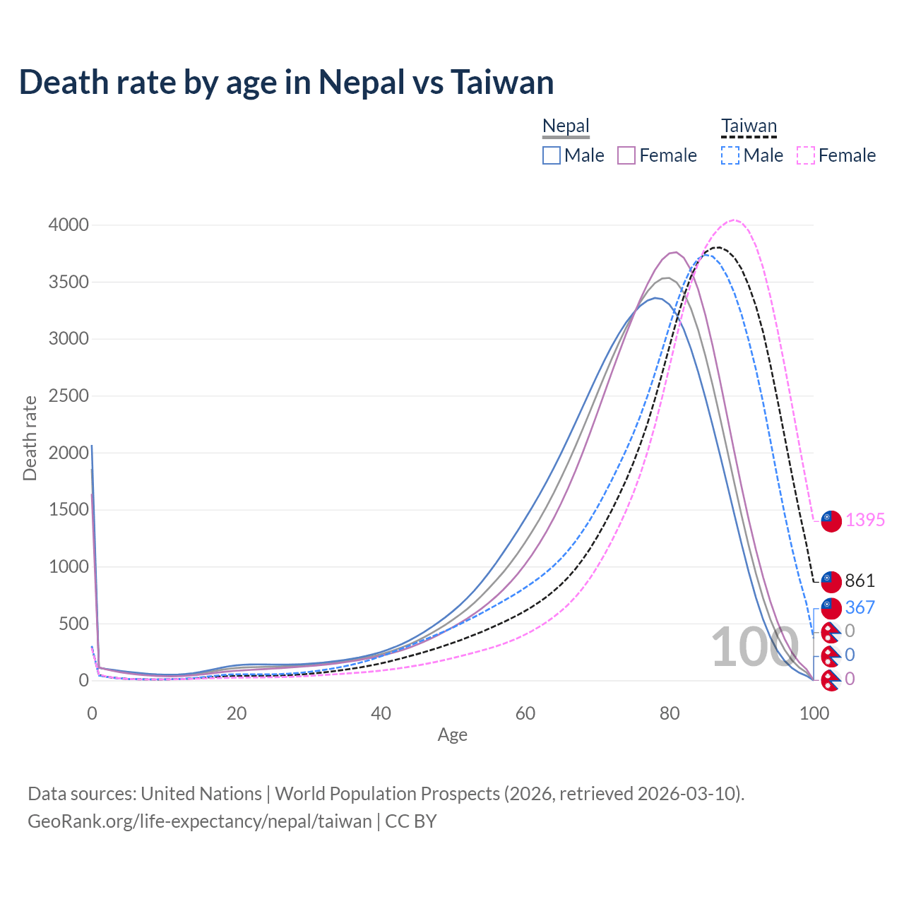 In Nepal, the most common age of death is 80, compared to 87 in Taiwan. The median age of death is 75.4 in Nepal and 84.3 in Taiwan, meaning only half of each cohort is expected to live past that age.