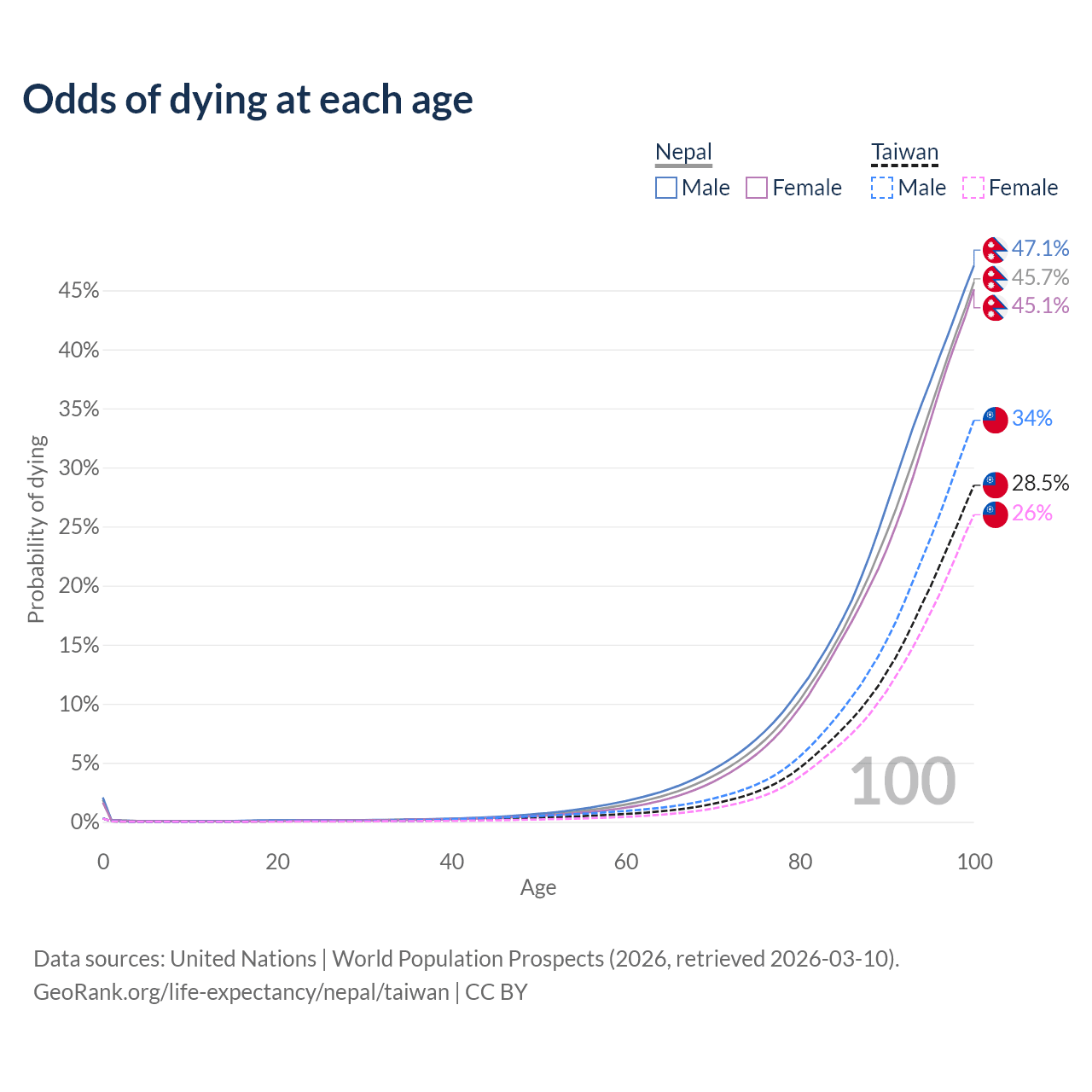 This life expectancy calculator shows the odds of living to 100, 95, 90, and below based on current age for both males and females in Nepal and Taiwan, along with mean and median age of death. The calculations are based on the 2026 life tables (actuarial tables) from the UN World Population Prospects.