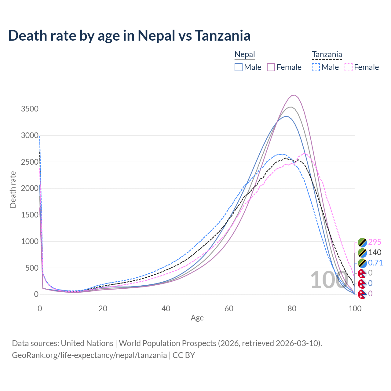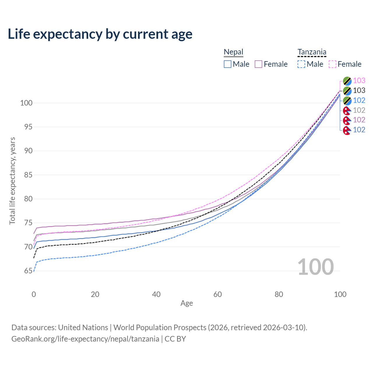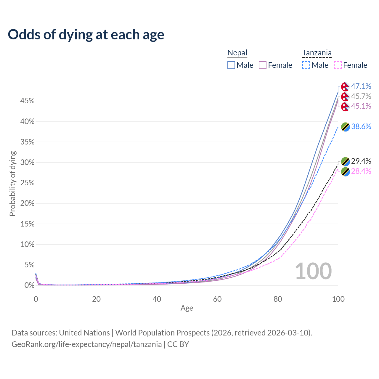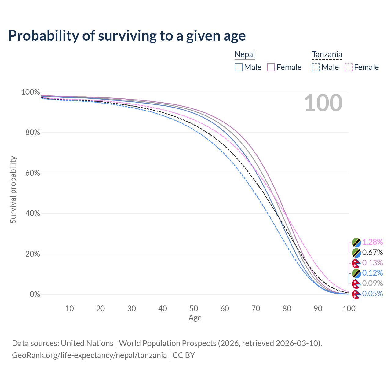 This life expectancy calculator shows the odds of living to 100, 95, 90, and below based on current age for both males and females in Nepal and Tanzania, along with mean and median age of death. The calculations are based on the 2026 life tables (actuarial tables) from the UN World Population Prospects.