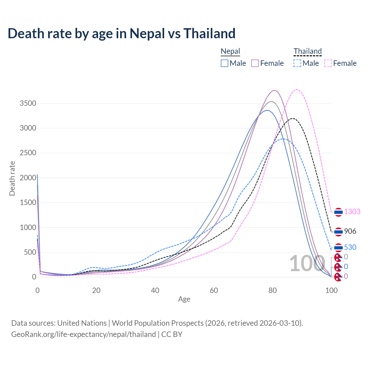 In Nepal, the most common age of death is 80, compared to 87 in Thailand. The median age of death is 75.4 in Nepal and 81.8 in Thailand, meaning only half of each cohort is expected to live past that age.