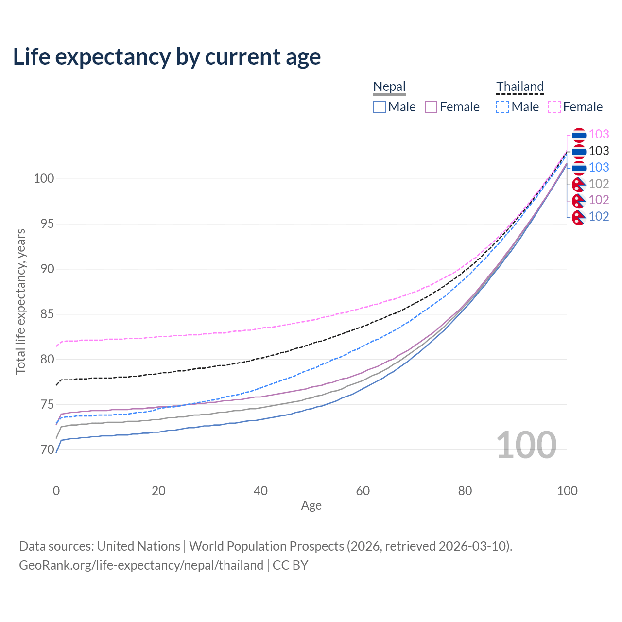 This life expectancy calculator shows the odds of living to 100, 95, 90, and below based on current age for both males and females in Nepal and Thailand, along with mean and median age of death. The calculations are based on the 2026 life tables (actuarial tables) from the UN World Population Prospects.