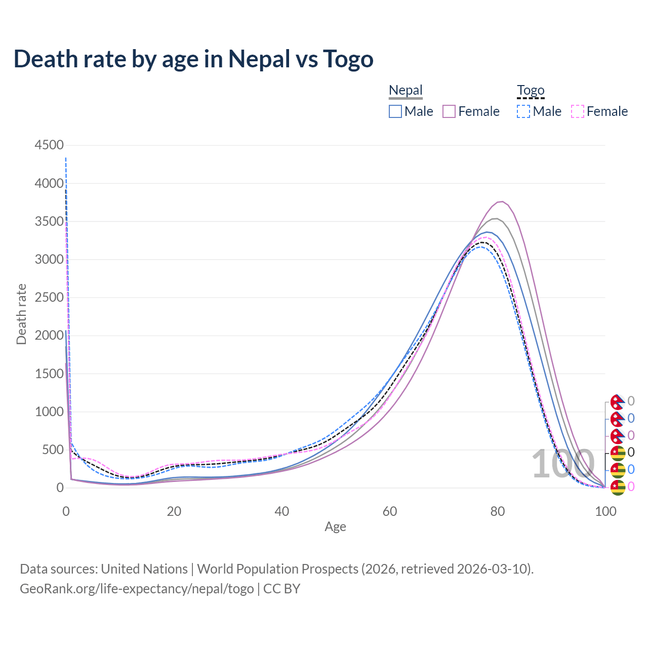 The average life expectancy at birth is 71.2 years in Nepal vs 63.3 in Togo. Nepal is ranked 131/197 by life expectancy, and Togo is 181/197. In Nepal, the life expectancy is 69.6 years for males and 72.7 years for females. In Togo, it's 63 years for males and 63.6 years for females.