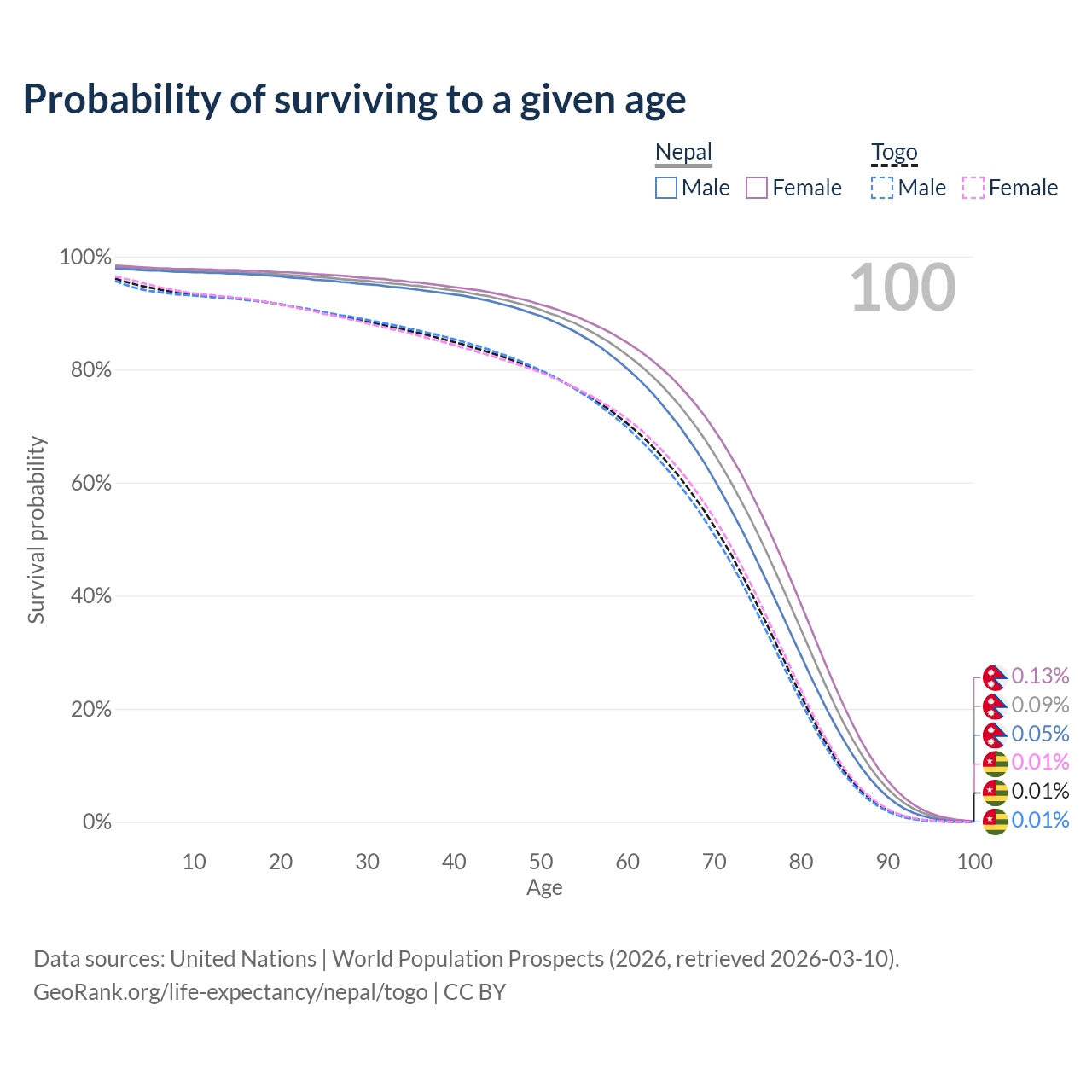 This life expectancy calculator shows the odds of living to 100, 95, 90, and below based on current age for both males and females in Nepal and Togo, along with mean and median age of death. The calculations are based on the 2026 life tables (actuarial tables) from the UN World Population Prospects.
