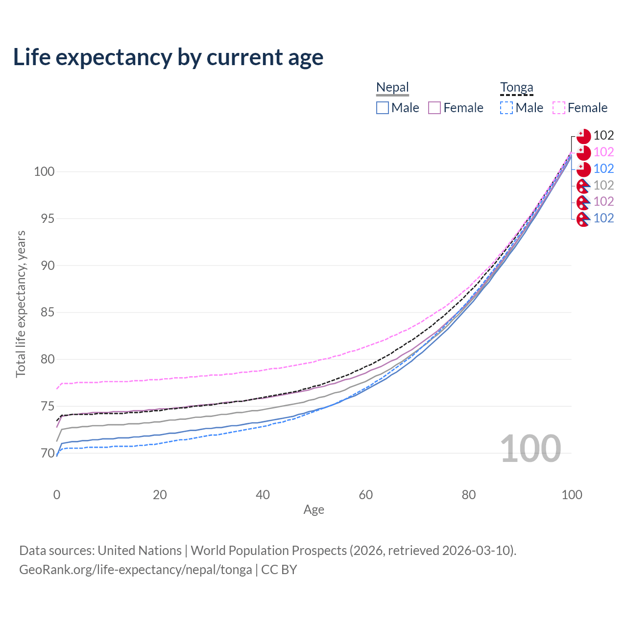This life expectancy calculator shows the odds of living to 100, 95, 90, and below based on current age for both males and females in Nepal and Tonga, along with mean and median age of death. The calculations are based on the 2026 life tables (actuarial tables) from the UN World Population Prospects.