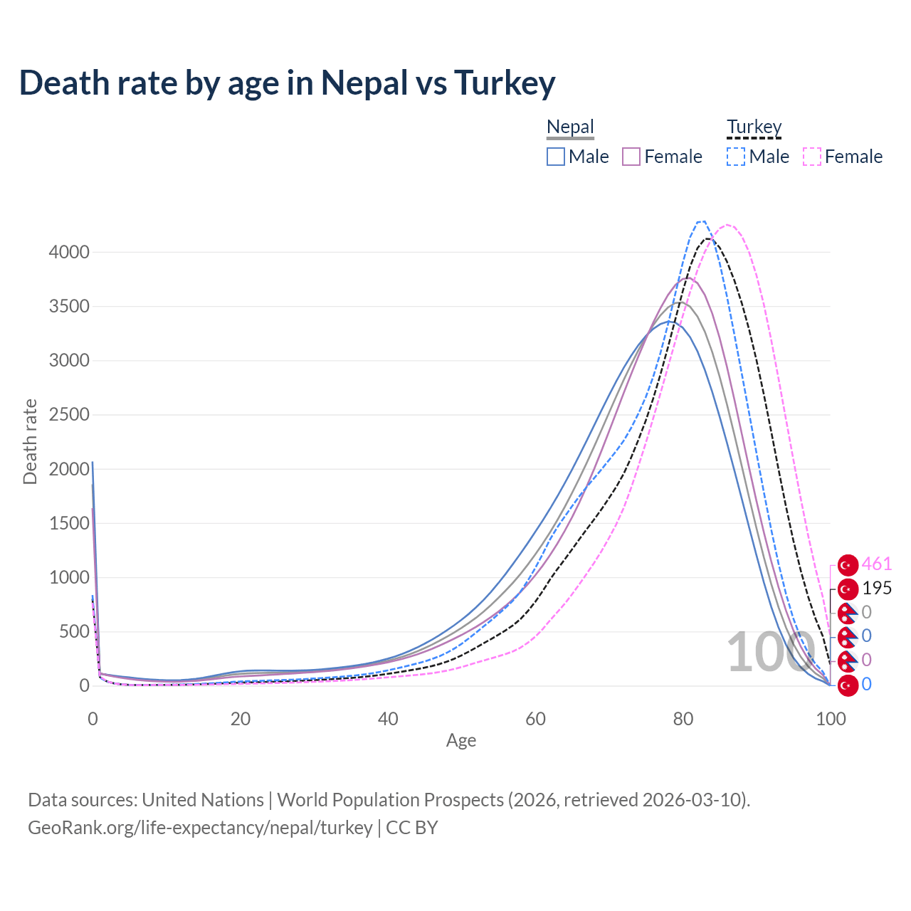 In Nepal, the most common age of death is 80, compared to 83 in Turkey. The median age of death is 75.4 in Nepal and 81.4 in Turkey, meaning only half of each cohort is expected to live past that age.