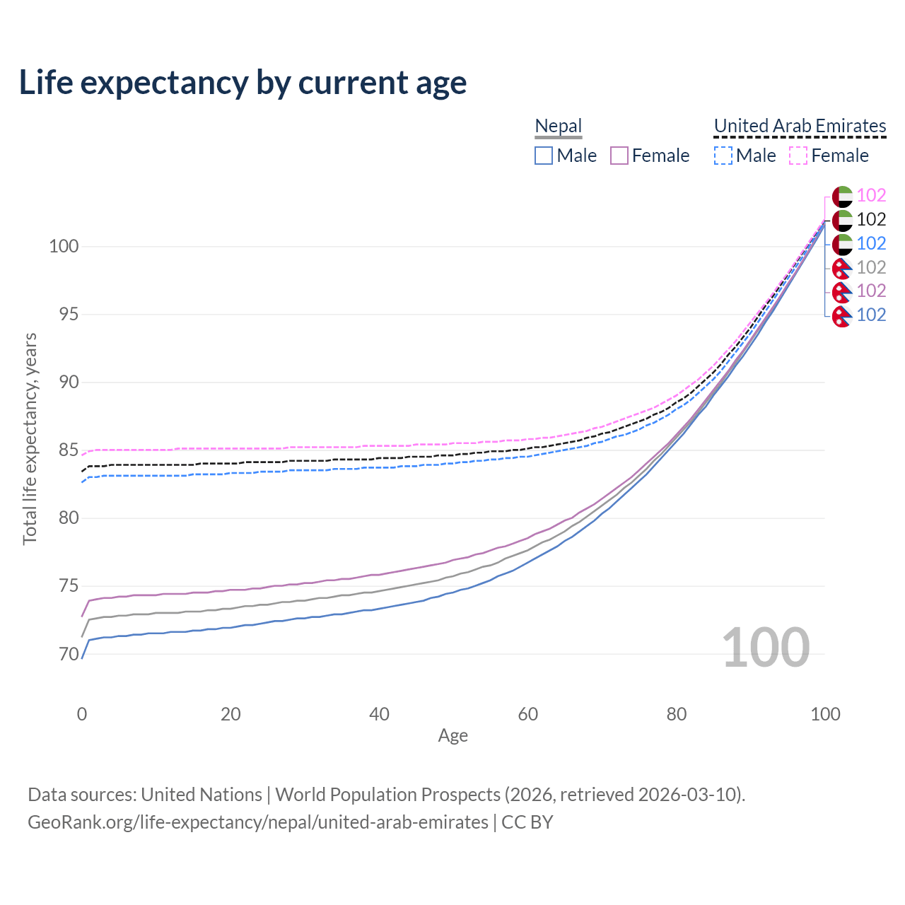 This life expectancy calculator shows the odds of living to 100, 95, 90, and below based on current age for both males and females in Nepal and the United Arab Emirates, along with mean and median age of death. The calculations are based on the 2026 life tables (actuarial tables) from the UN World Population Prospects.