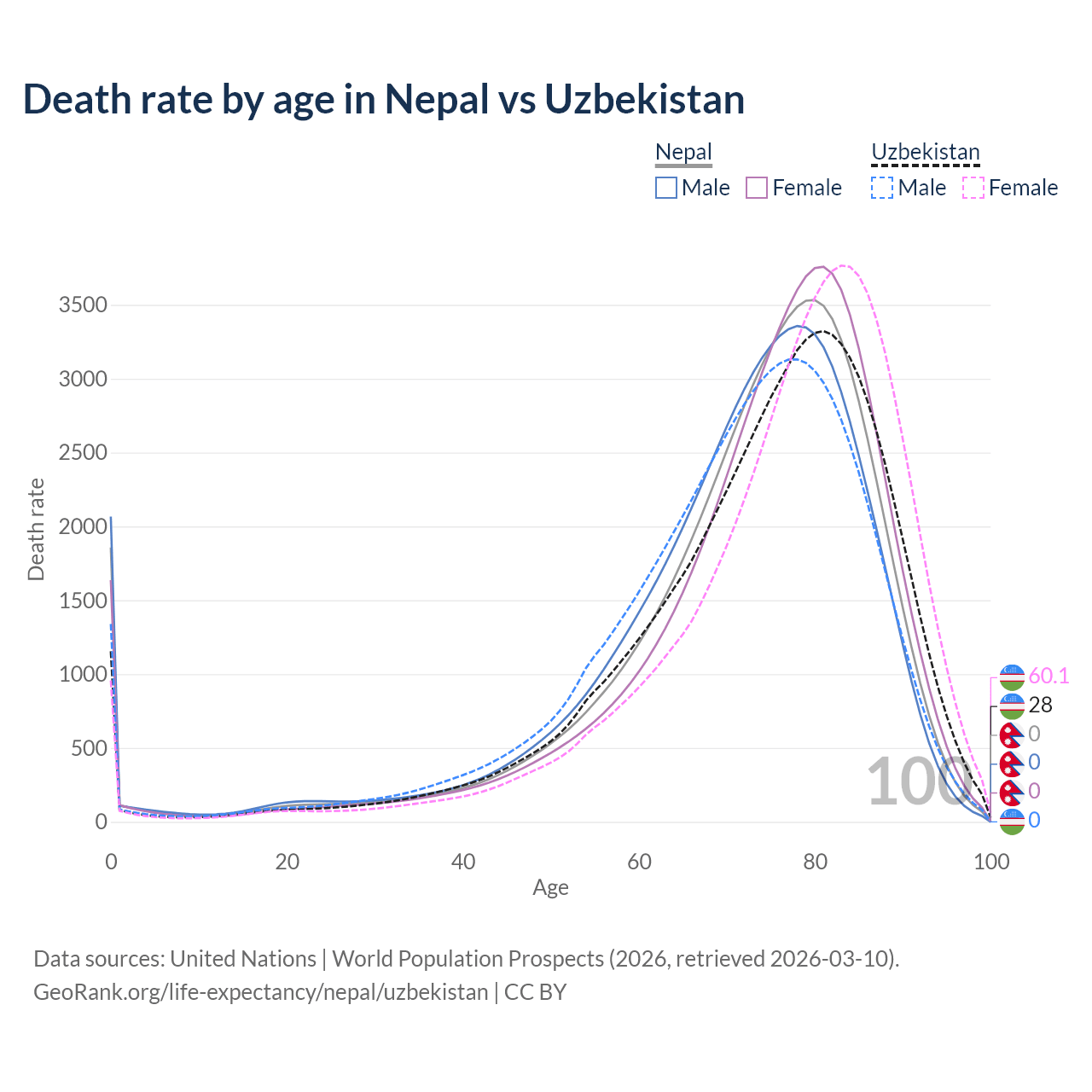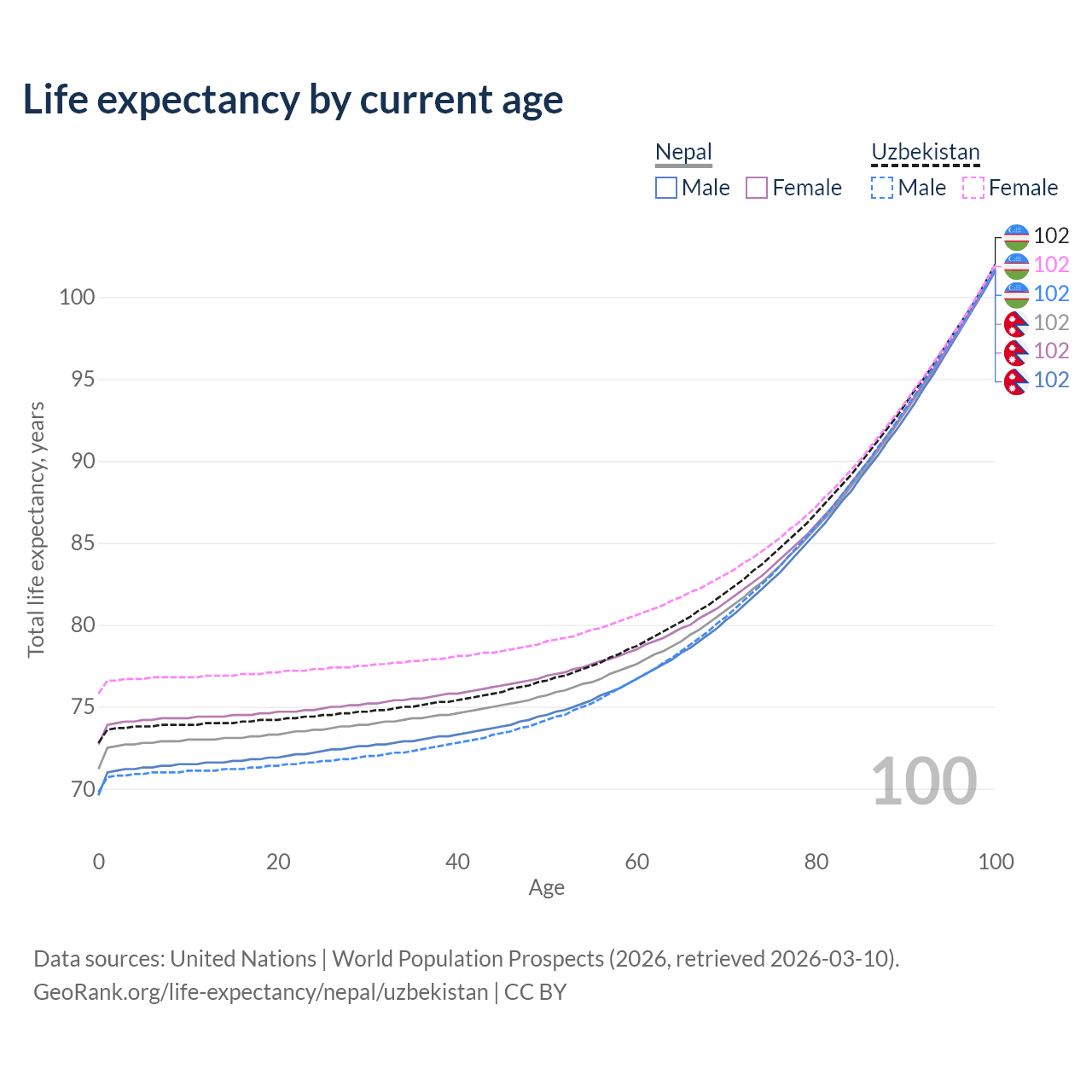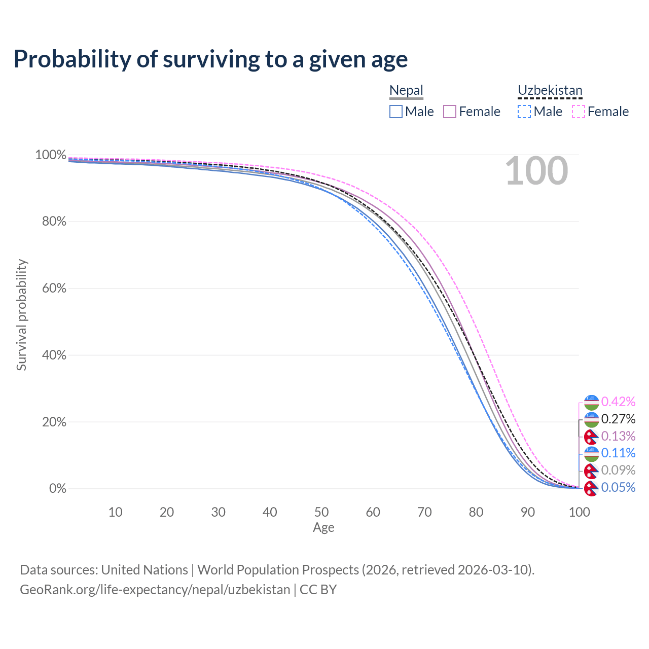 This life expectancy calculator shows the odds of living to 100, 95, 90, and below based on current age for both males and females in Nepal and Uzbekistan, along with mean and median age of death. The calculations are based on the 2026 life tables (actuarial tables) from the UN World Population Prospects.