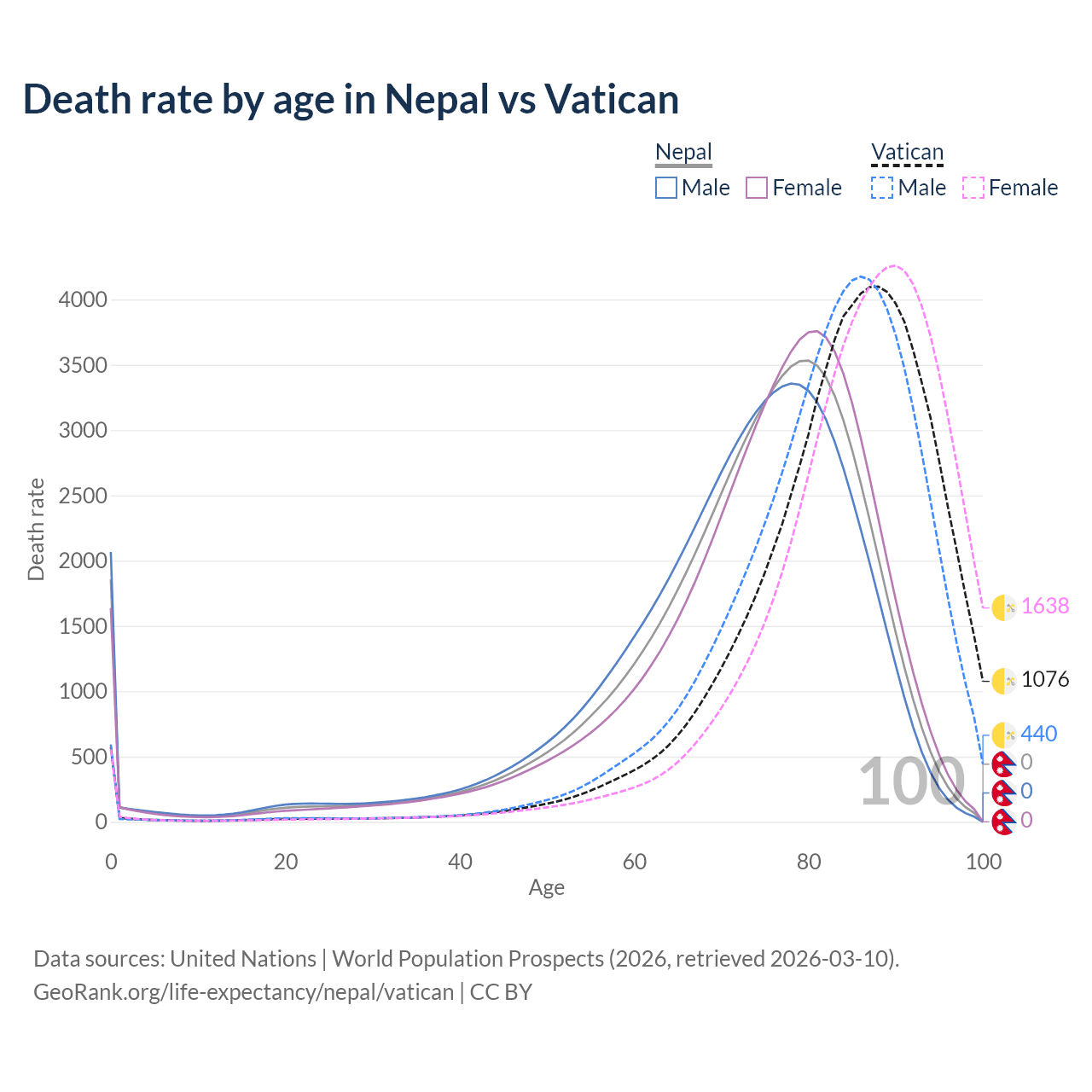 In Nepal, the most common age of death is 80, compared to 88 in the Vatican. The median age of death is 75.4 in Nepal and 85.7 in the Vatican, meaning only half of each cohort is expected to live past that age.