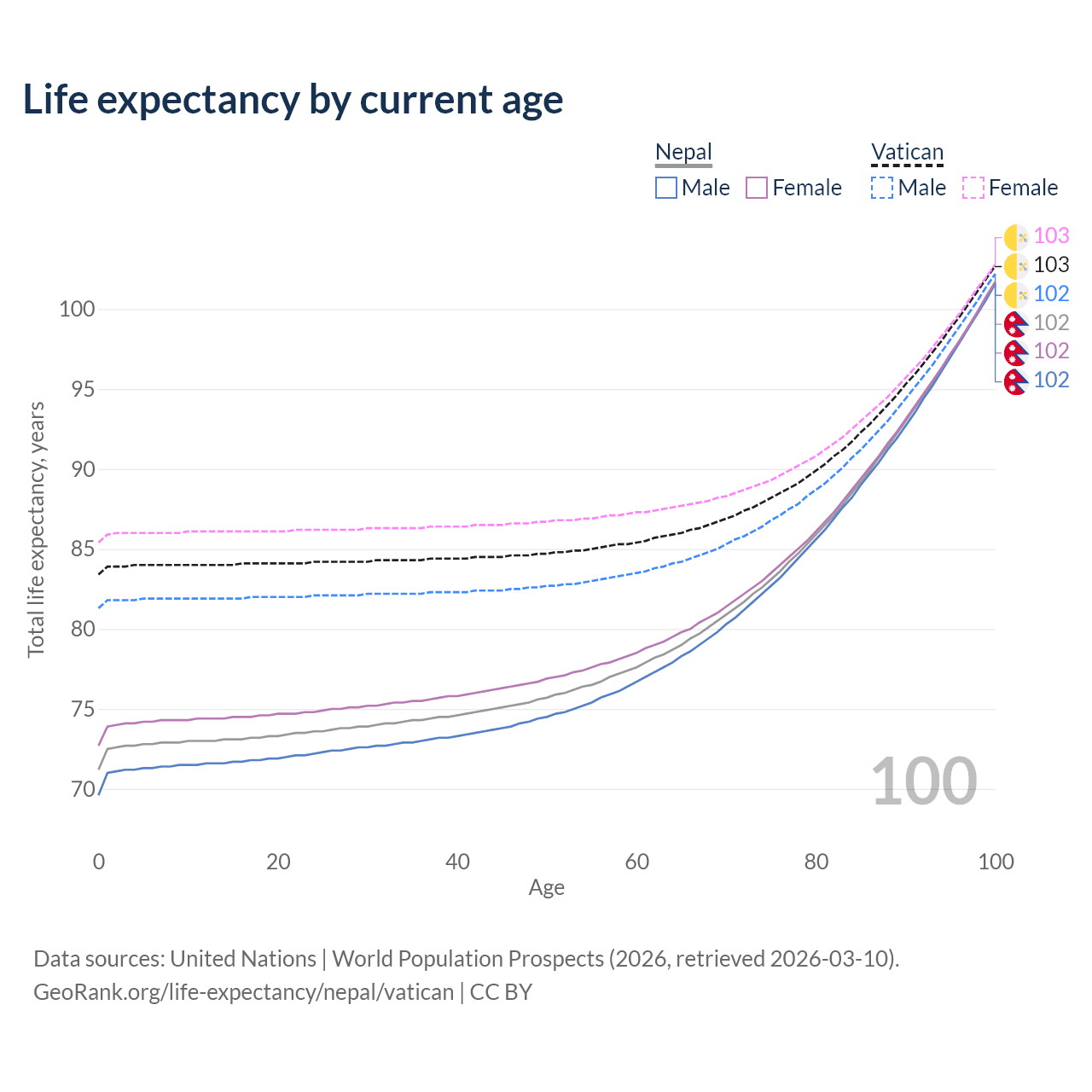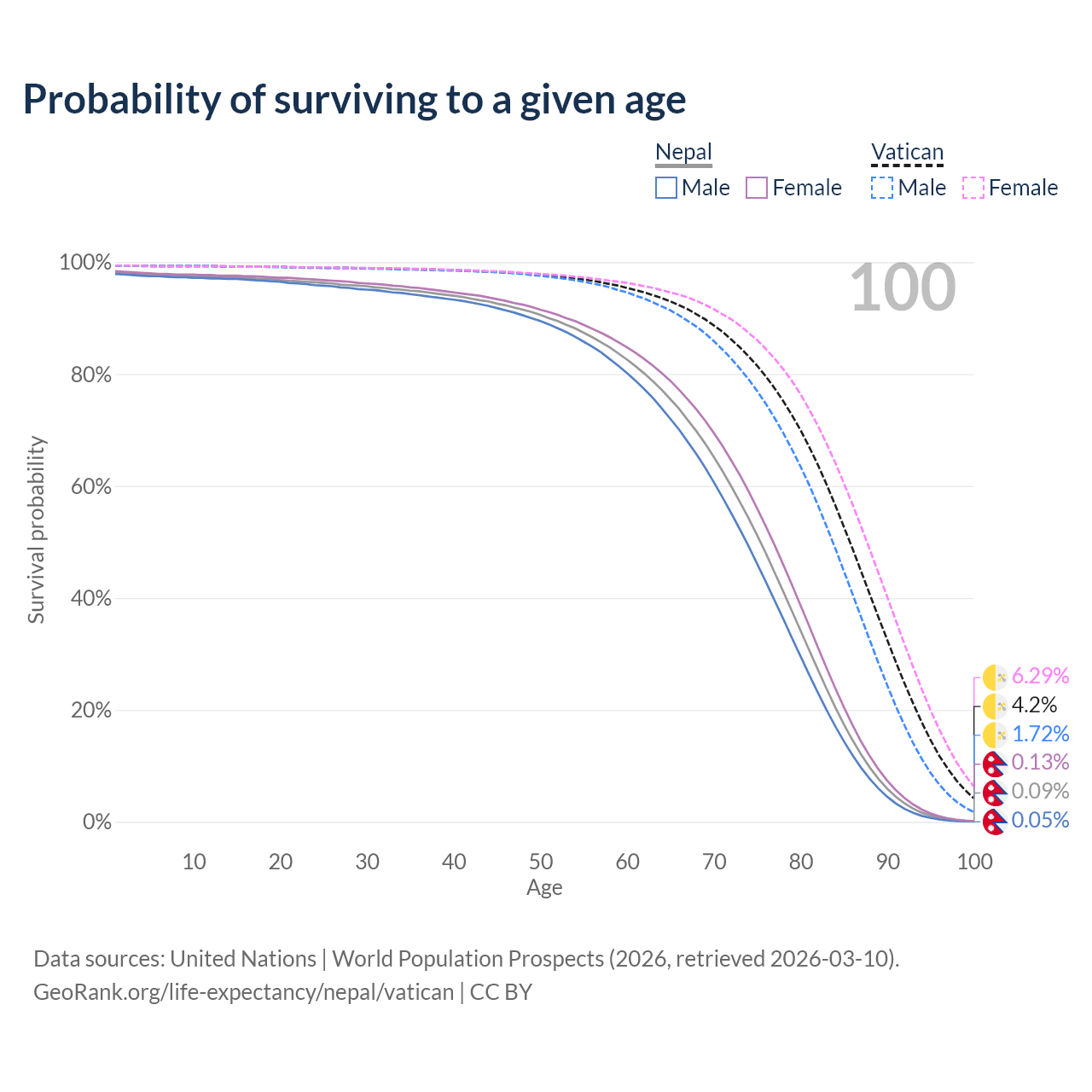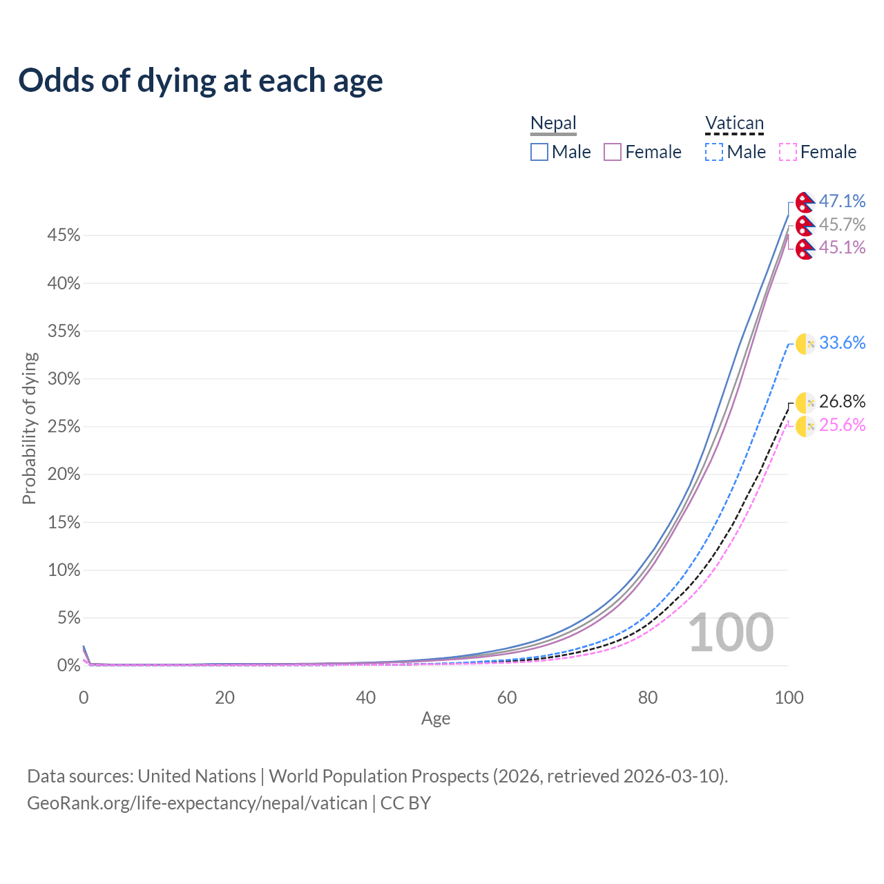 This life expectancy calculator shows the odds of living to 100, 95, 90, and below based on current age for both males and females in Nepal and the Vatican, along with mean and median age of death. The calculations are based on the 2026 life tables (actuarial tables) from the UN World Population Prospects.