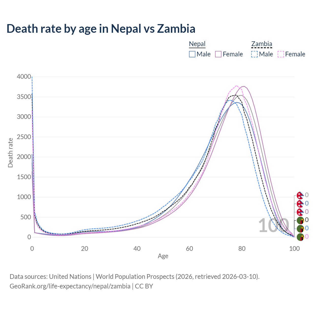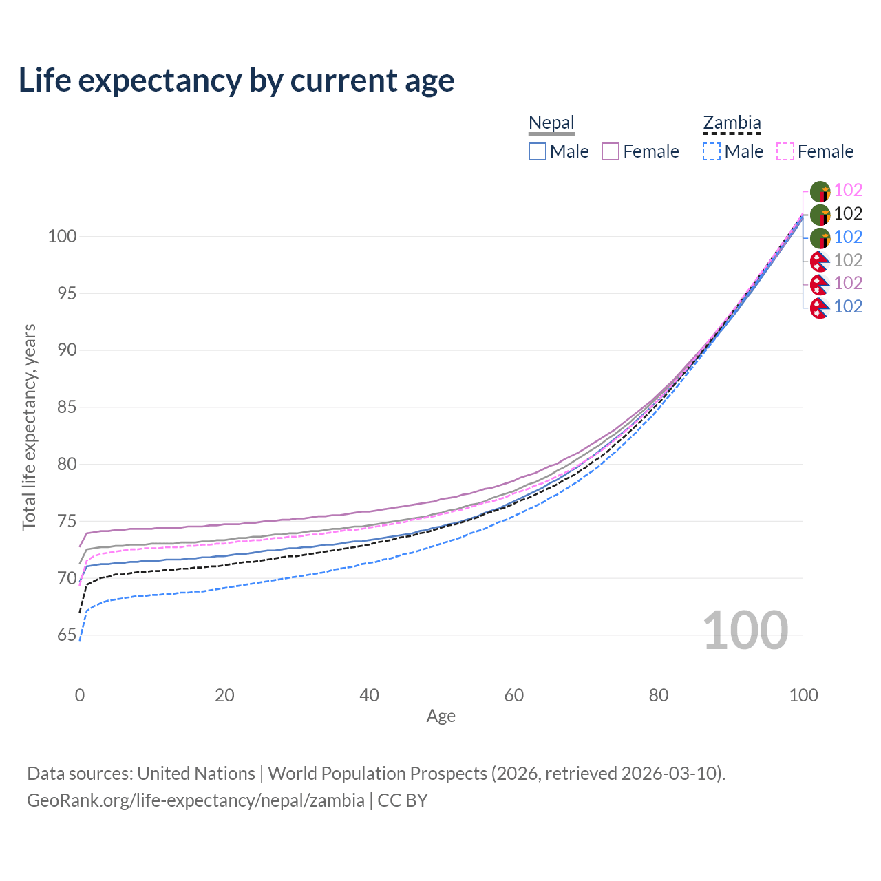 This life expectancy calculator shows the odds of living to 100, 95, 90, and below based on current age for both males and females in Nepal and Zambia, along with mean and median age of death. The calculations are based on the 2026 life tables (actuarial tables) from the UN World Population Prospects.