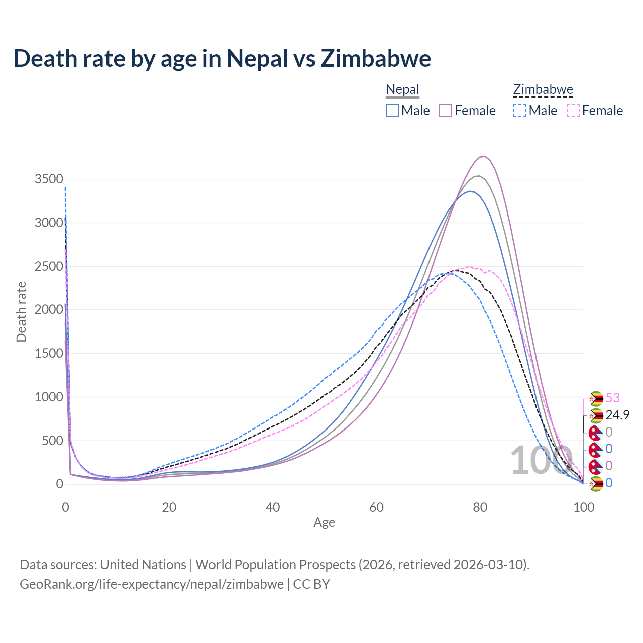 In Nepal, the most common age of death is 80, compared to 0 in Zimbabwe. The median age of death is 75.4 in Nepal and 68.8 in Zimbabwe, meaning only half of each cohort is expected to live past that age.