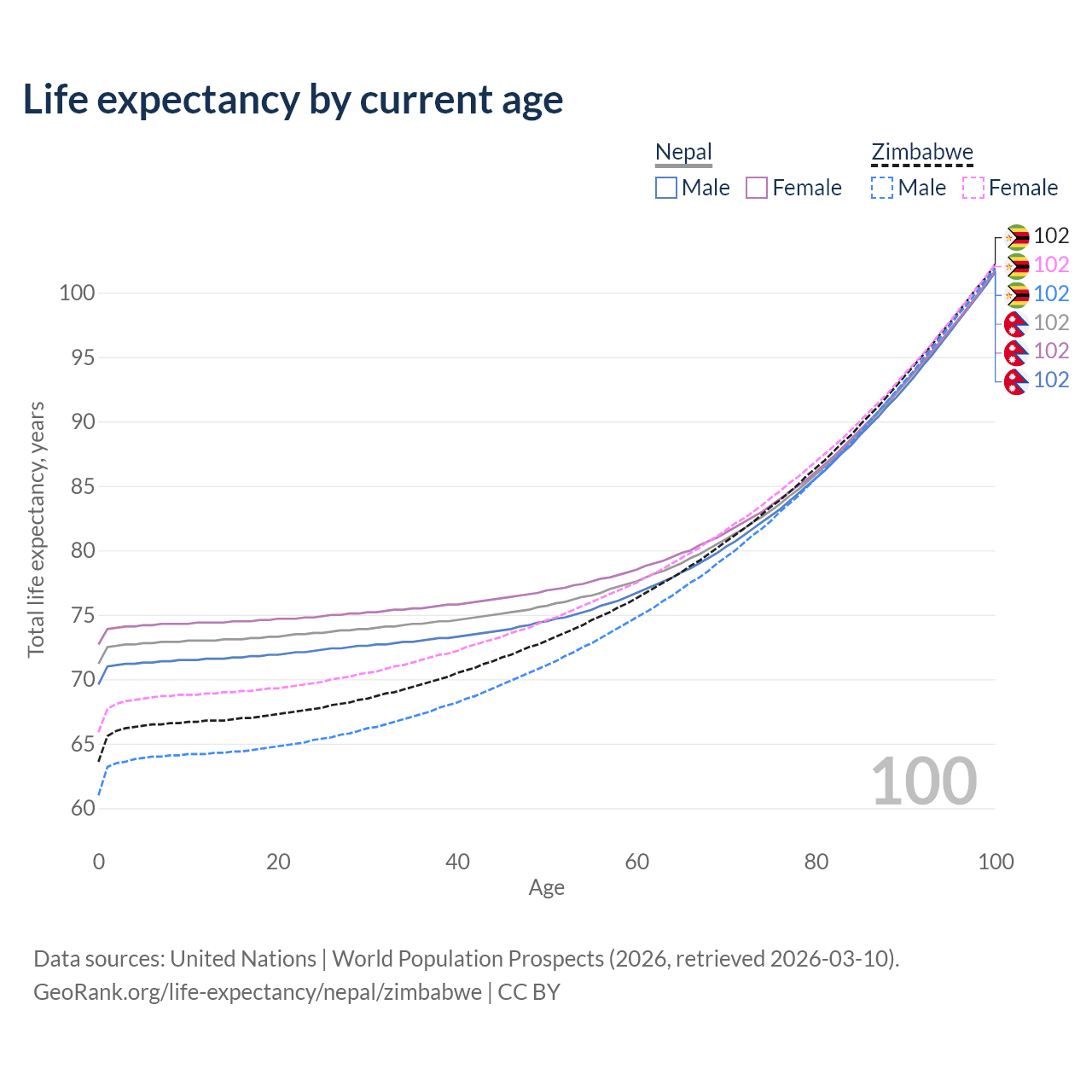 This life expectancy calculator shows the odds of living to 100, 95, 90, and below based on current age for both males and females in Nepal and Zimbabwe, along with mean and median age of death. The calculations are based on the 2026 life tables (actuarial tables) from the UN World Population Prospects.