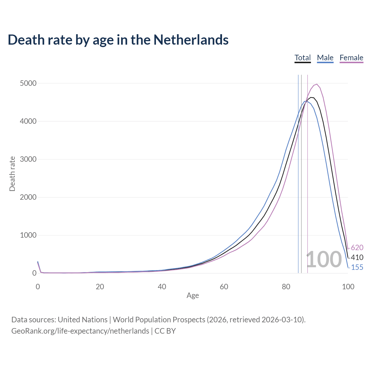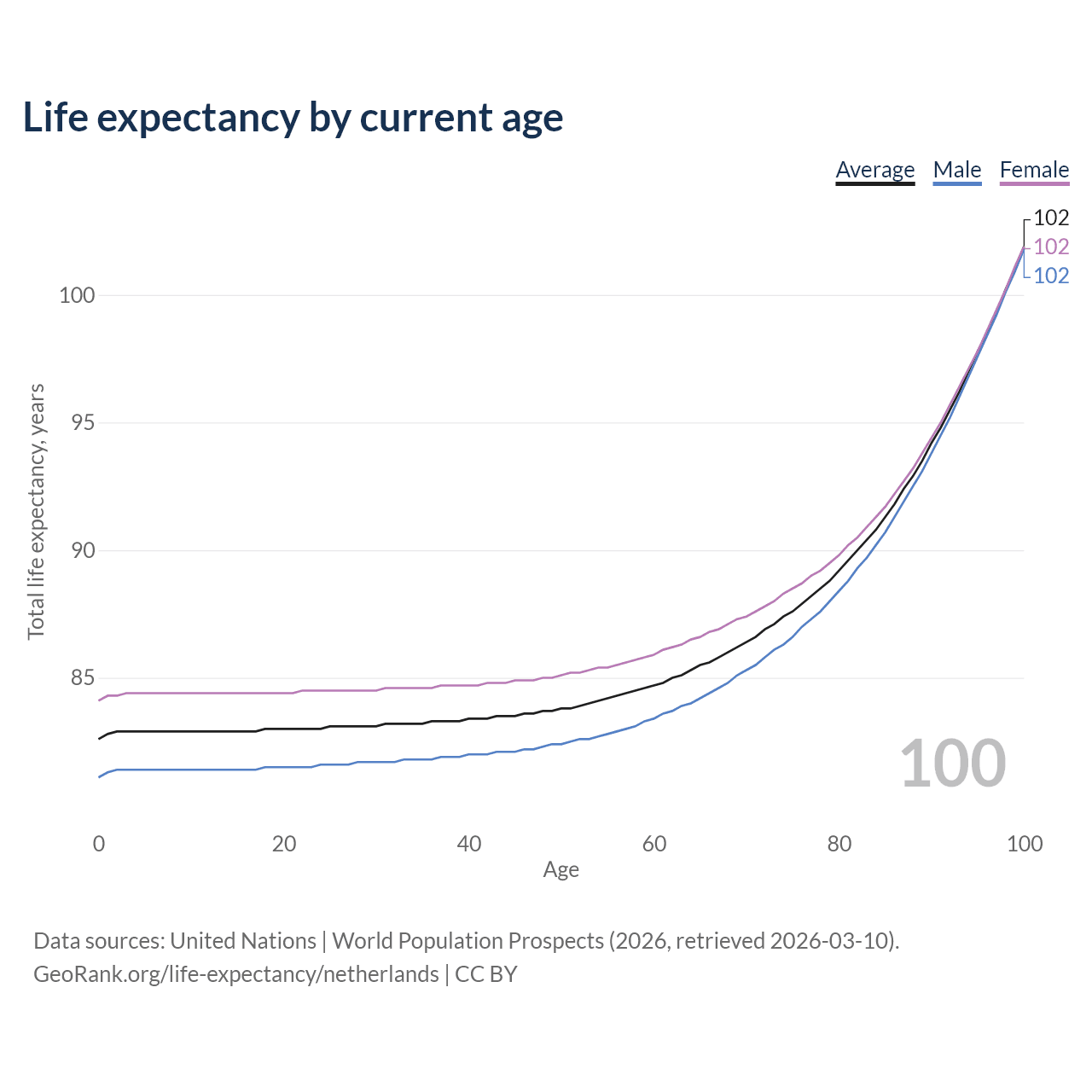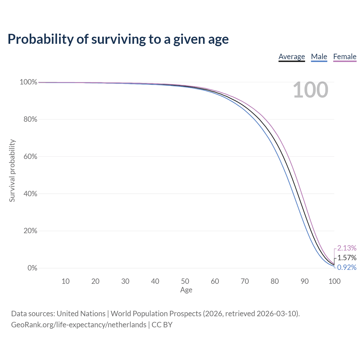 This life expectancy calculator shows the odds of living to 100, 95, 90, and below based on current age for both males and females in the Netherlands, along with mean and median age of death. The calculations are based on the 2026 life tables (actuarial tables) from the UN World Population Prospects.