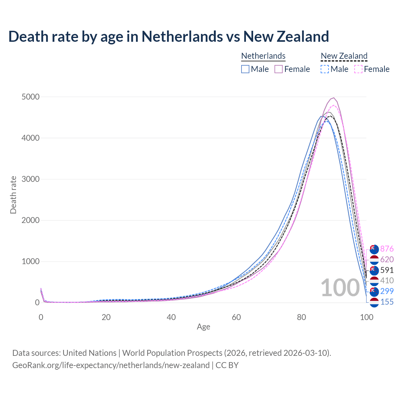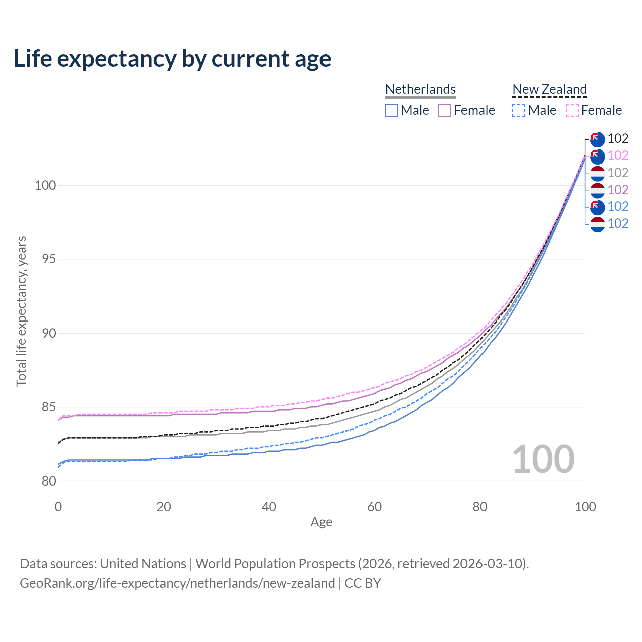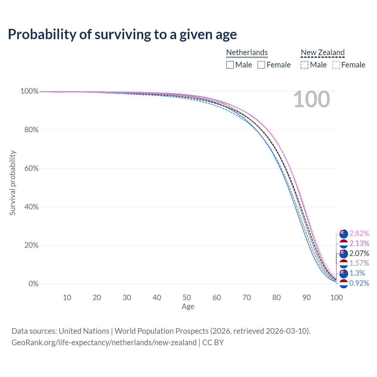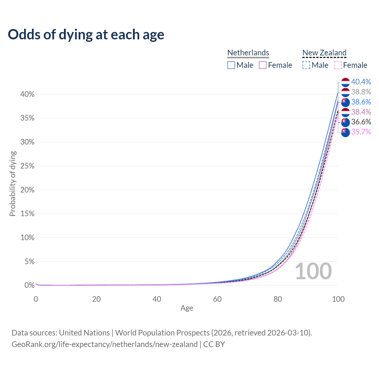 This life expectancy calculator shows the odds of living to 100, 95, 90, and below based on current age for both males and females in the Netherlands and New Zealand, along with mean and median age of death. The calculations are based on the 2026 life tables (actuarial tables) from the UN World Population Prospects.