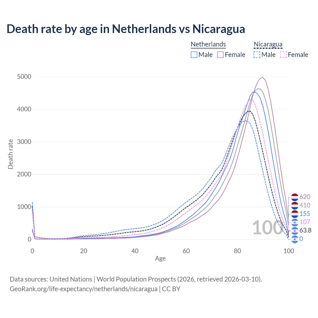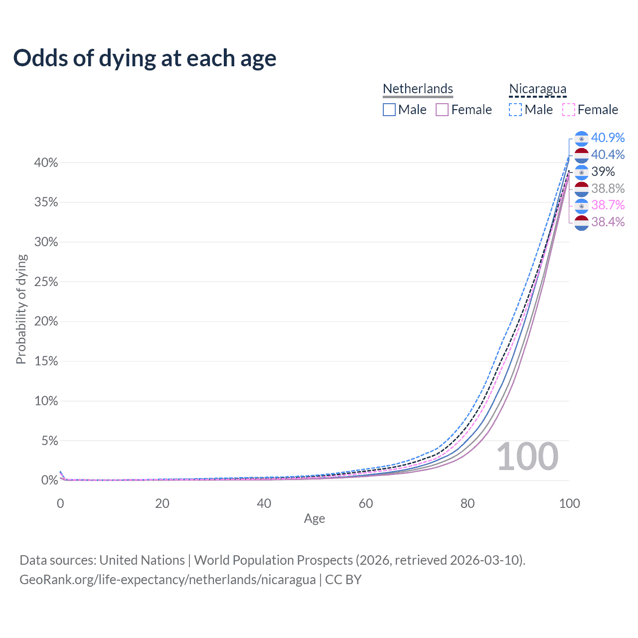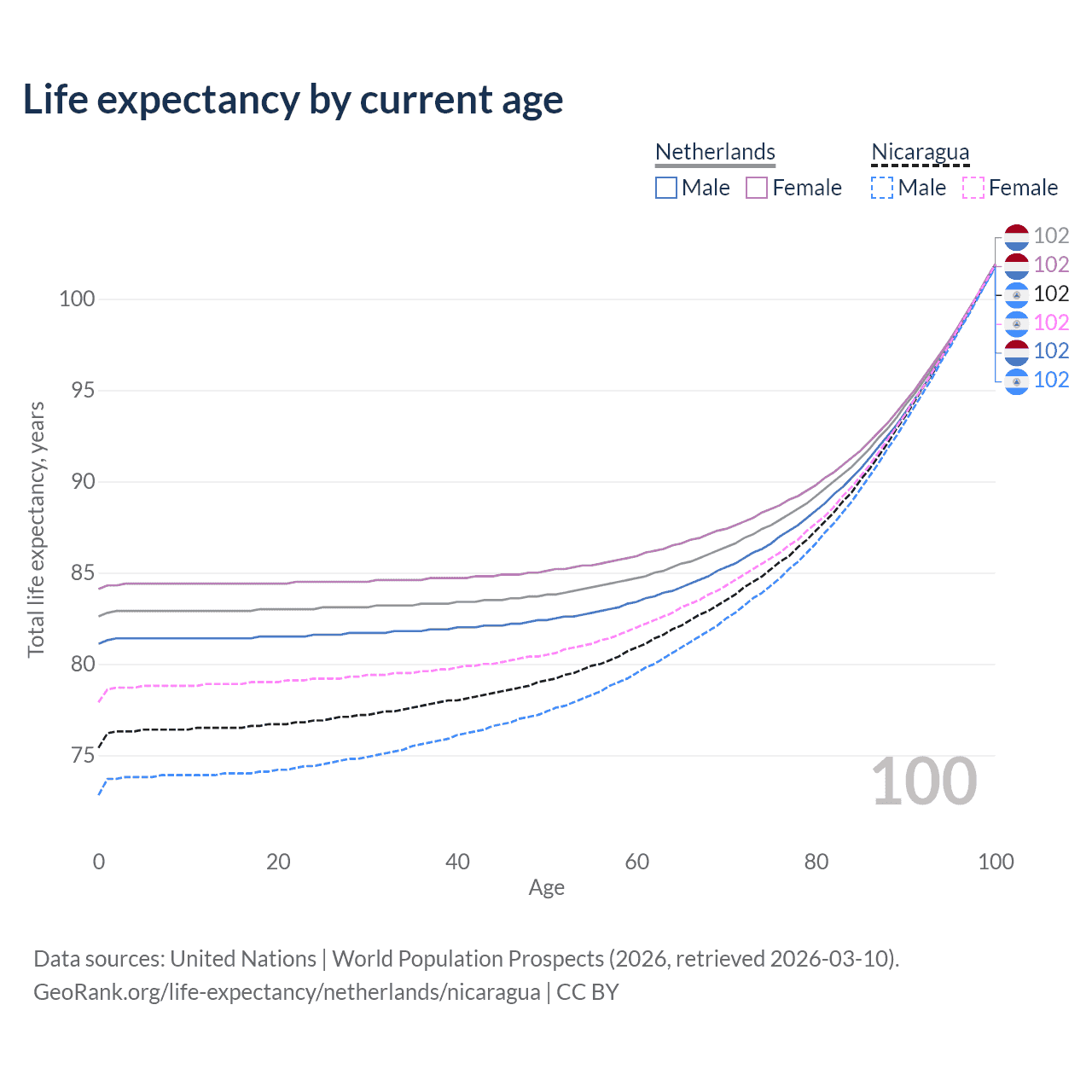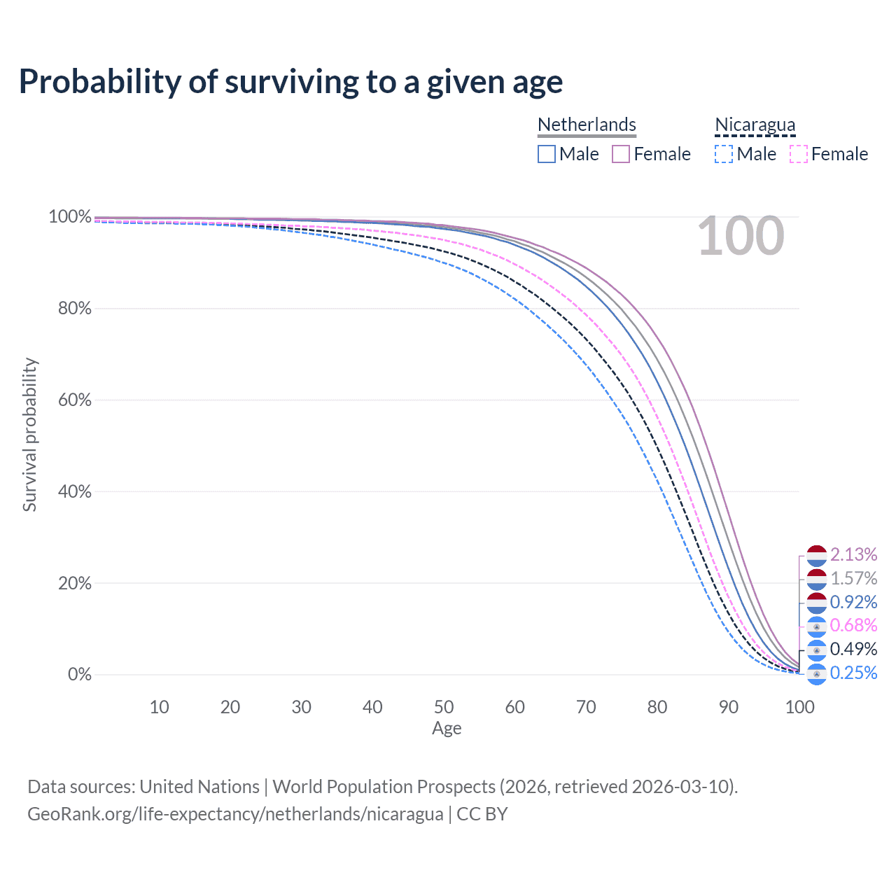 This life expectancy calculator shows the odds of living to 100, 95, 90, and below based on current age for both males and females in the Netherlands and Nicaragua, along with mean and median age of death. The calculations are based on the 2026 life tables (actuarial tables) from the UN World Population Prospects.