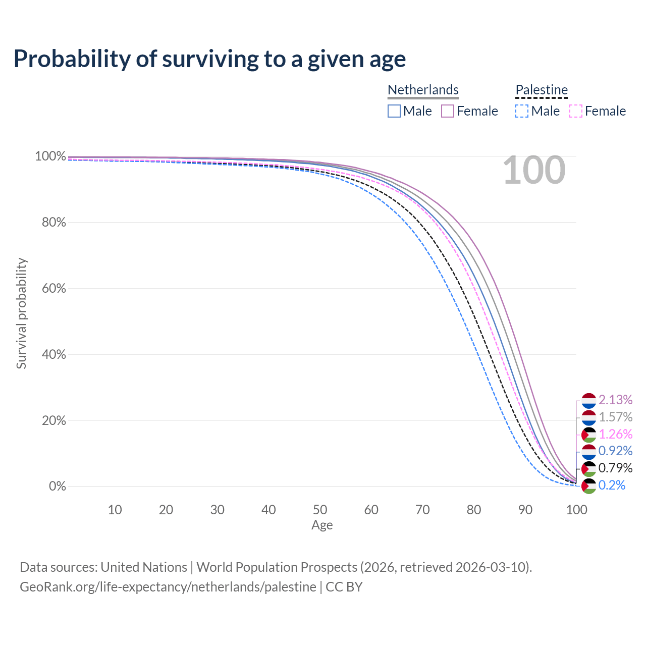 This life expectancy calculator shows the odds of living to 100, 95, 90, and below based on current age for both males and females in the Netherlands and Palestine, along with mean and median age of death. The calculations are based on the 2026 life tables (actuarial tables) from the UN World Population Prospects.