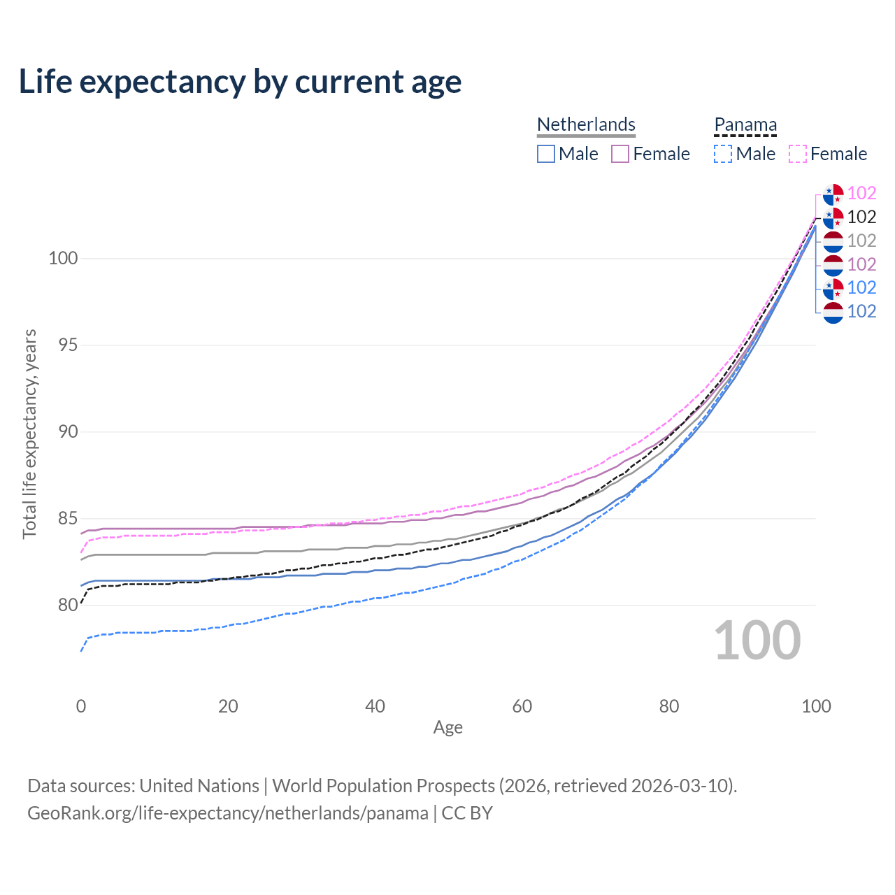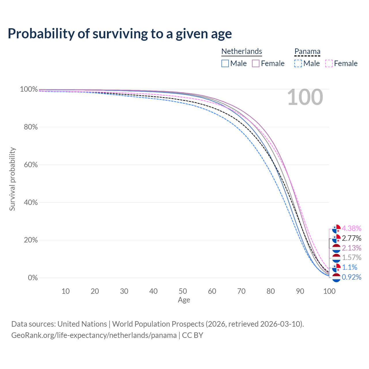 This life expectancy calculator shows the odds of living to 100, 95, 90, and below based on current age for both males and females in the Netherlands and Panama, along with mean and median age of death. The calculations are based on the 2026 life tables (actuarial tables) from the UN World Population Prospects.