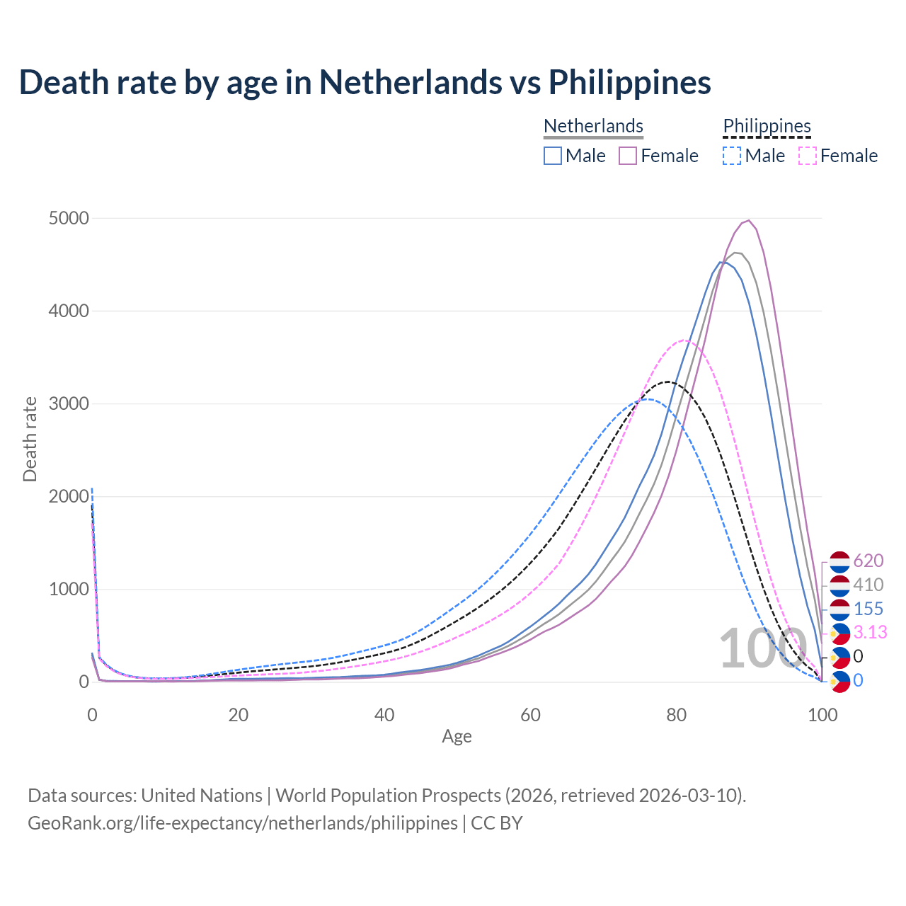 In the Netherlands, the most common age of death is 88, compared to 79 in the Philippines. The median age of death is 85.5 in the Netherlands and 74.6 in the Philippines, meaning only half of each cohort is expected to live past that age.