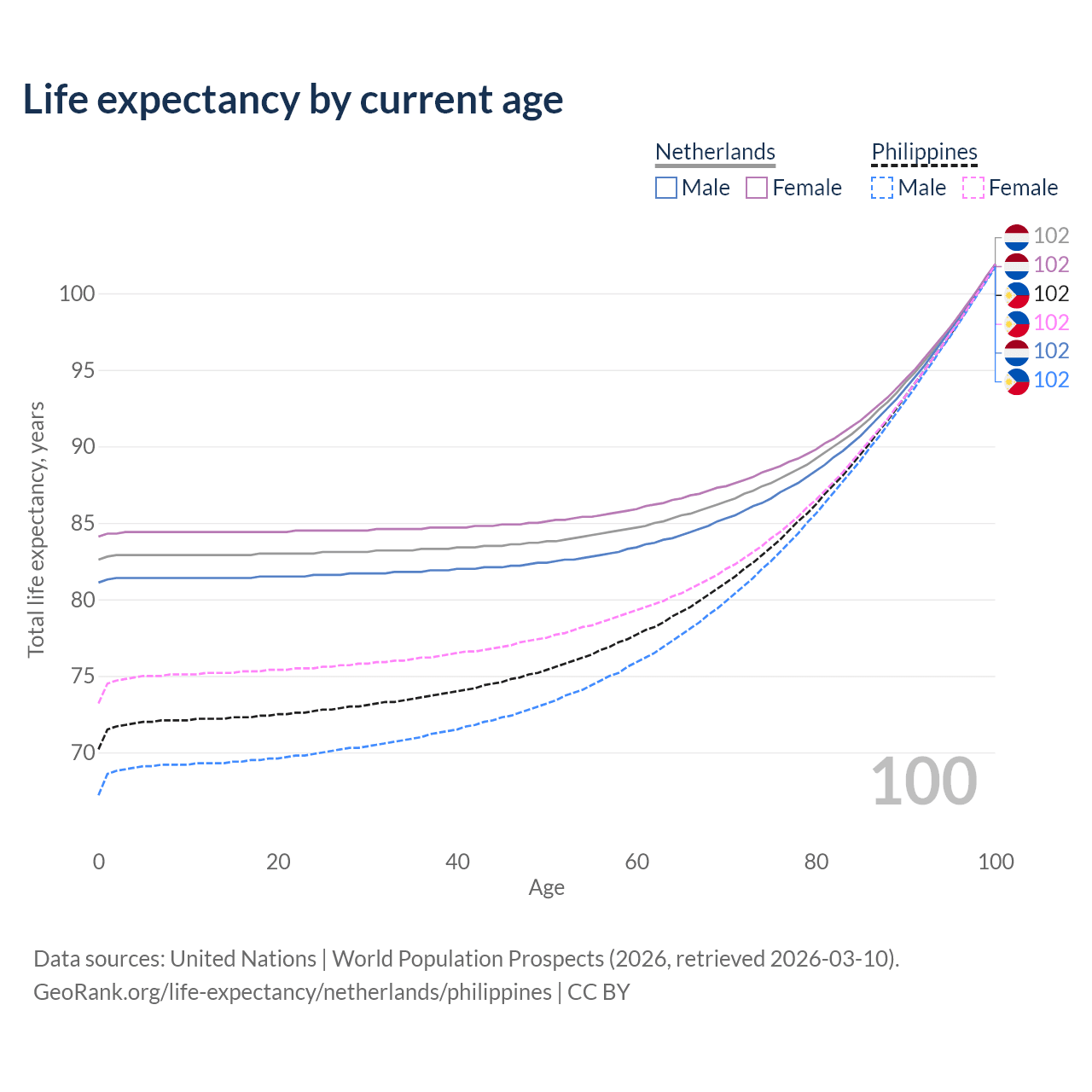 This life expectancy calculator shows the odds of living to 100, 95, 90, and below based on current age for both males and females in the Netherlands and the Philippines, along with mean and median age of death. The calculations are based on the 2026 life tables (actuarial tables) from the UN World Population Prospects.