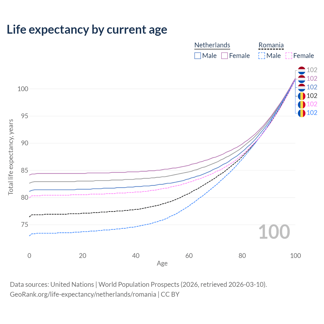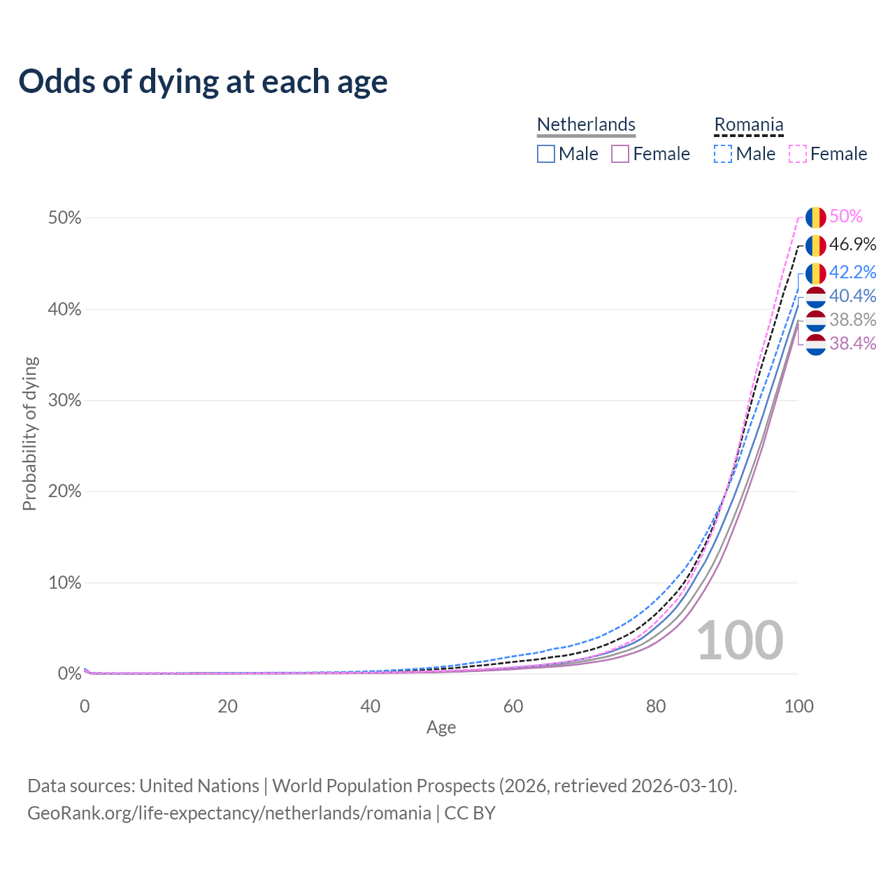 This life expectancy calculator shows the odds of living to 100, 95, 90, and below based on current age for both males and females in the Netherlands and Romania, along with mean and median age of death. The calculations are based on the 2026 life tables (actuarial tables) from the UN World Population Prospects.