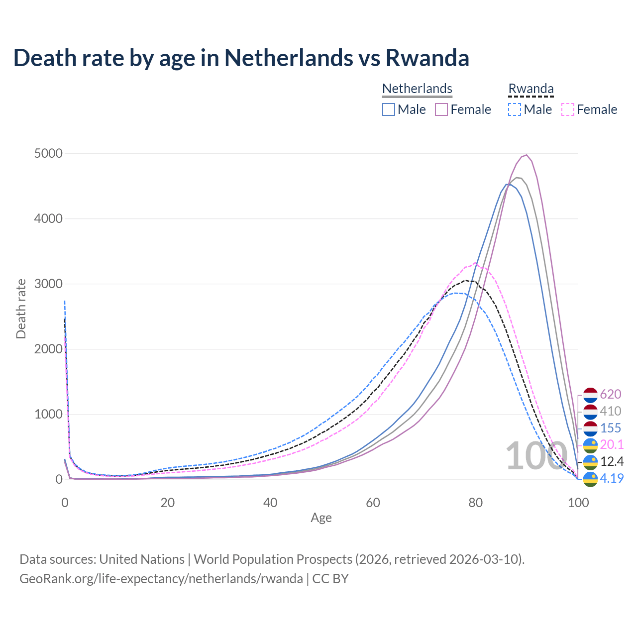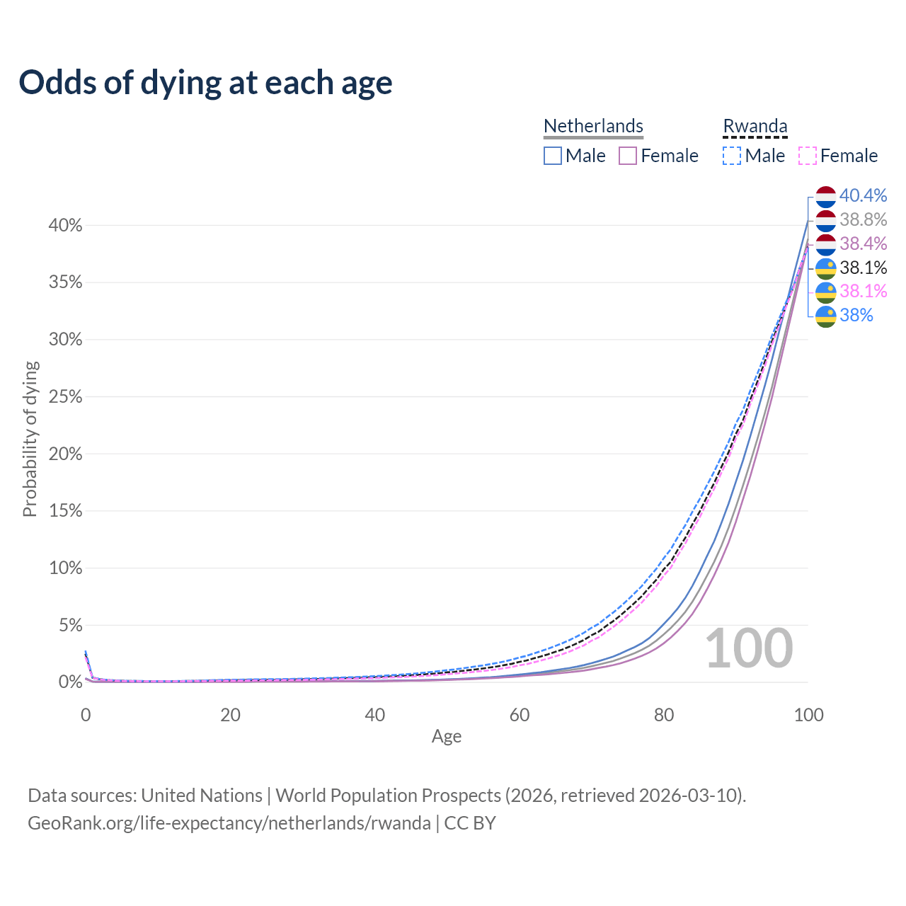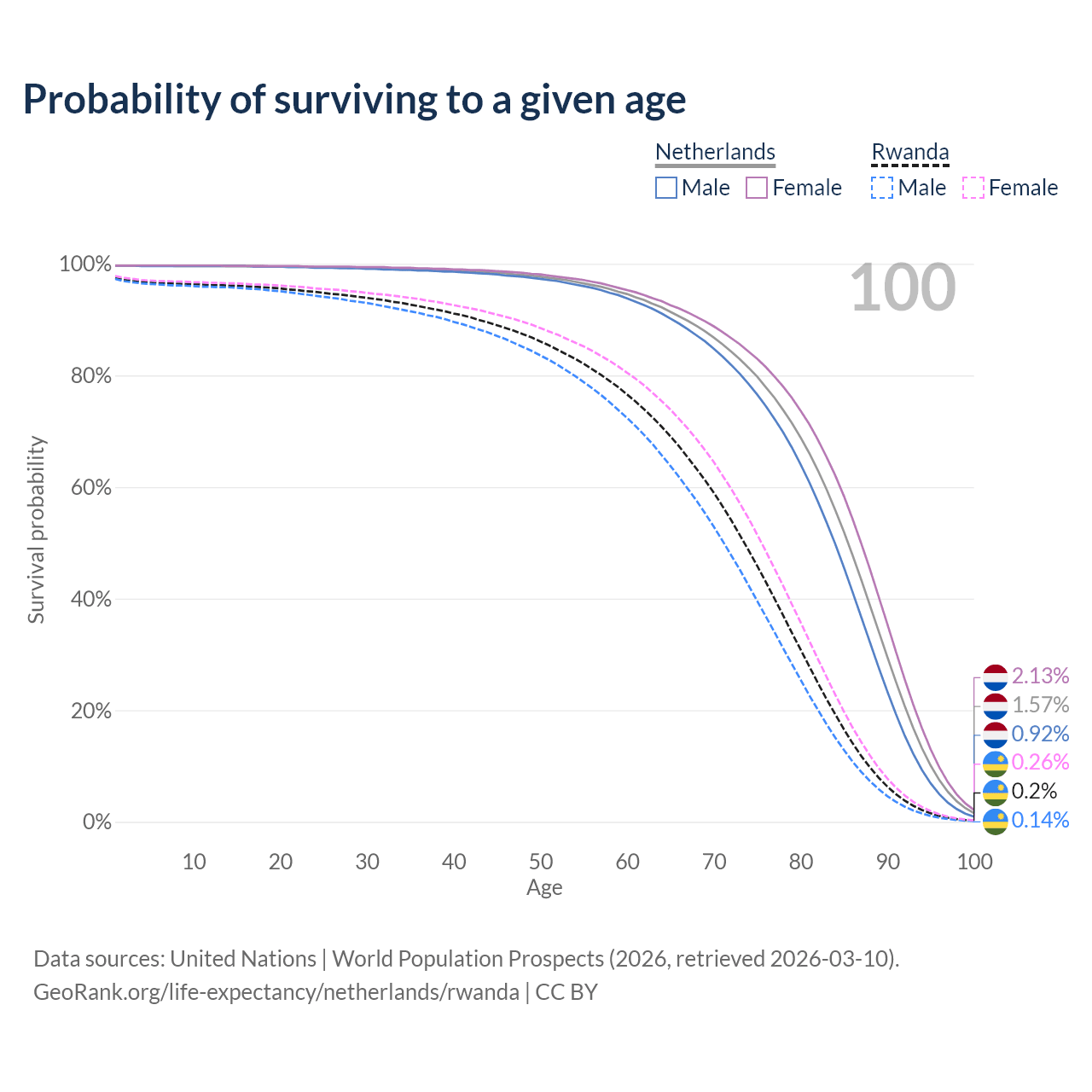 This life expectancy calculator shows the odds of living to 100, 95, 90, and below based on current age for both males and females in the Netherlands and Rwanda, along with mean and median age of death. The calculations are based on the 2026 life tables (actuarial tables) from the UN World Population Prospects.