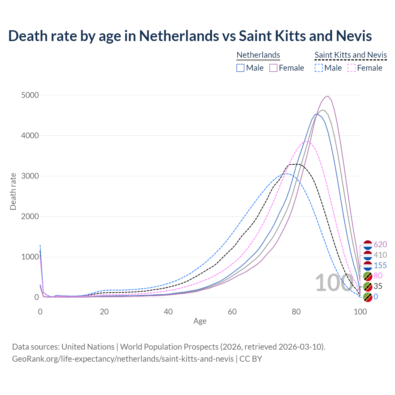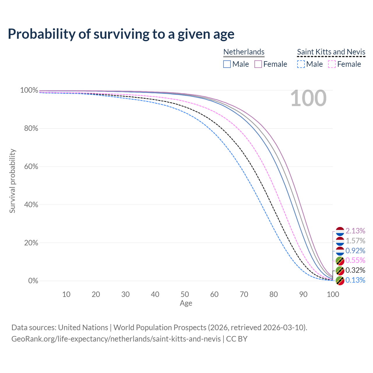 This life expectancy calculator shows the odds of living to 100, 95, 90, and below based on current age for both males and females in the Netherlands and Saint Kitts and Nevis, along with mean and median age of death. The calculations are based on the 2026 life tables (actuarial tables) from the UN World Population Prospects.