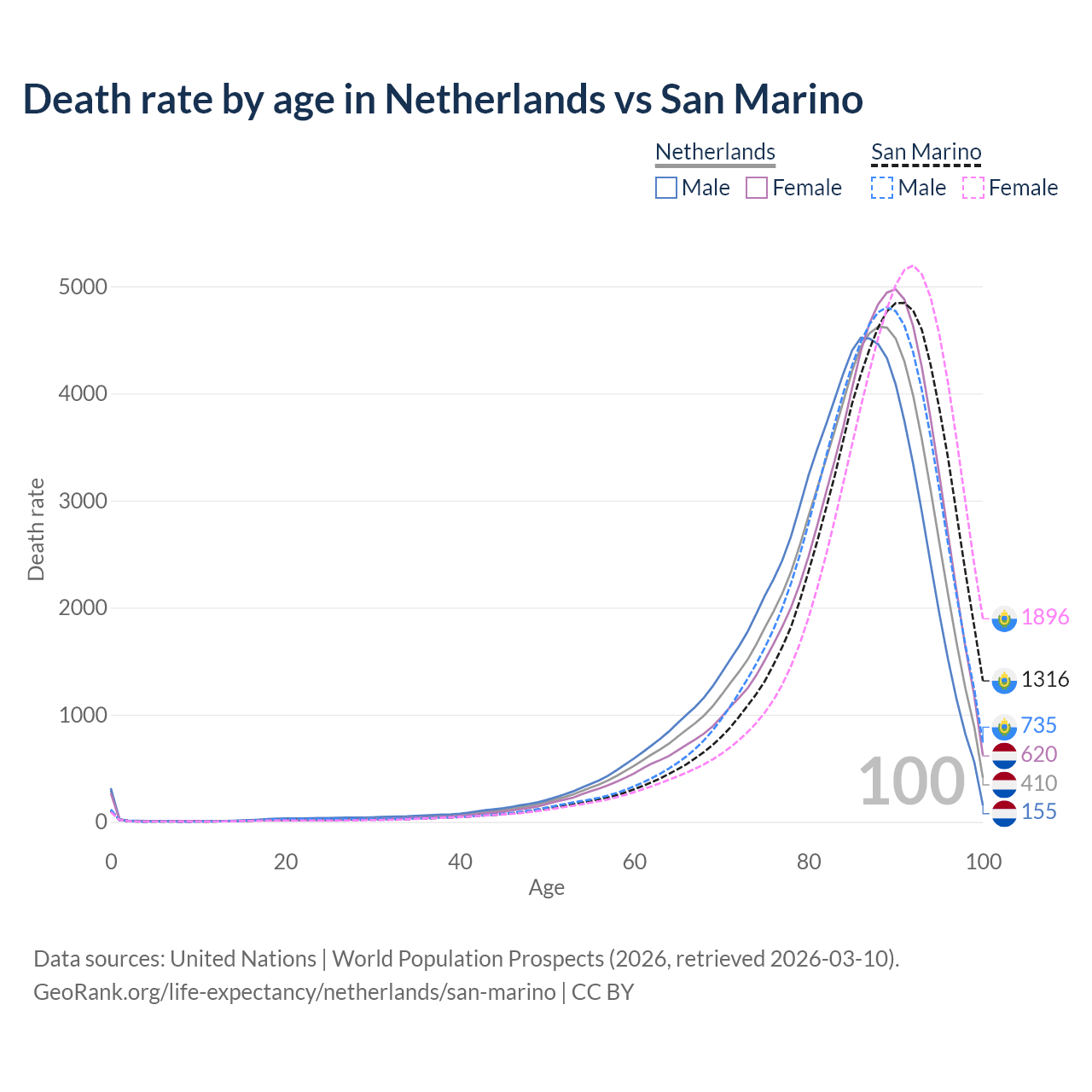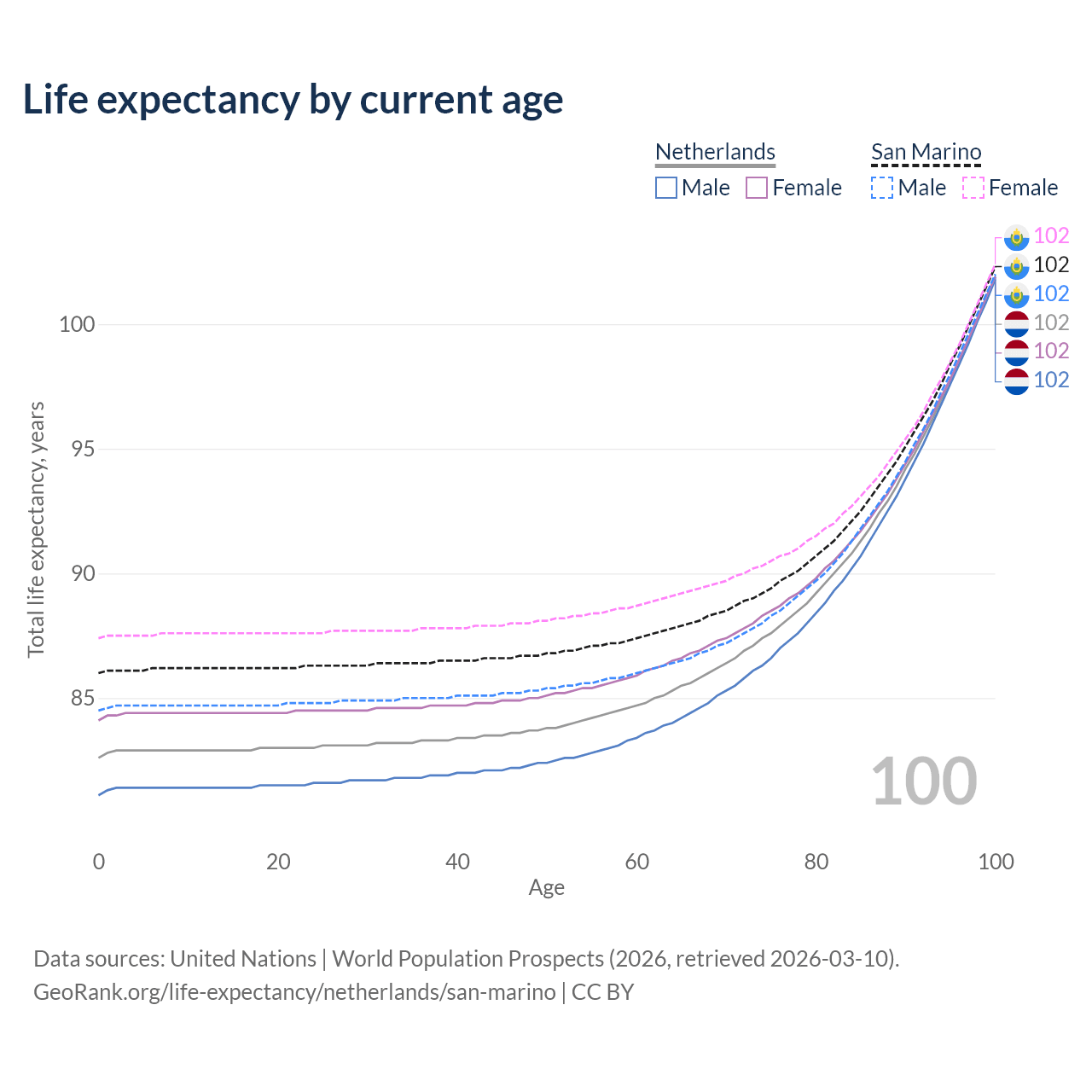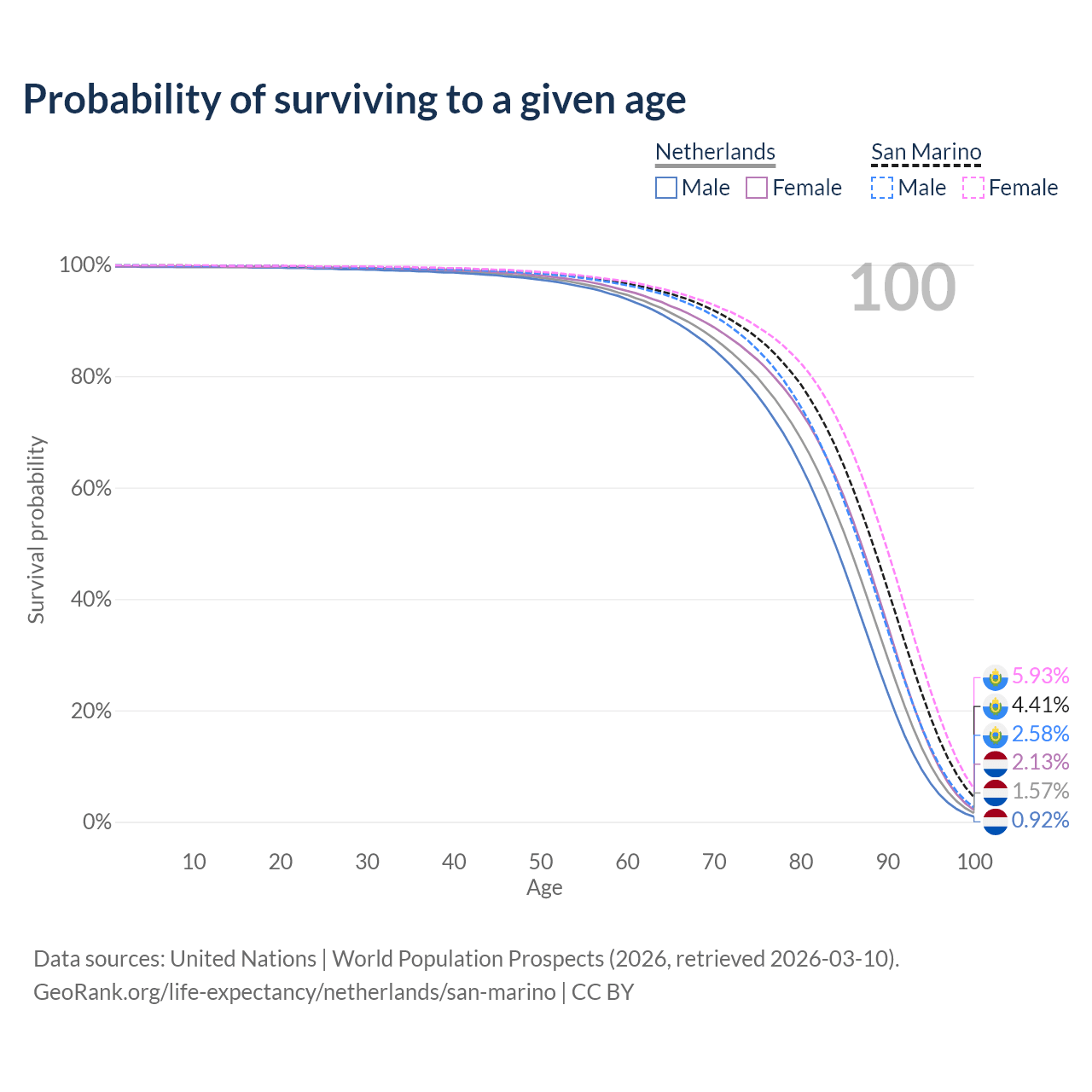 This life expectancy calculator shows the odds of living to 100, 95, 90, and below based on current age for both males and females in the Netherlands and San Marino, along with mean and median age of death. The calculations are based on the 2026 life tables (actuarial tables) from the UN World Population Prospects.