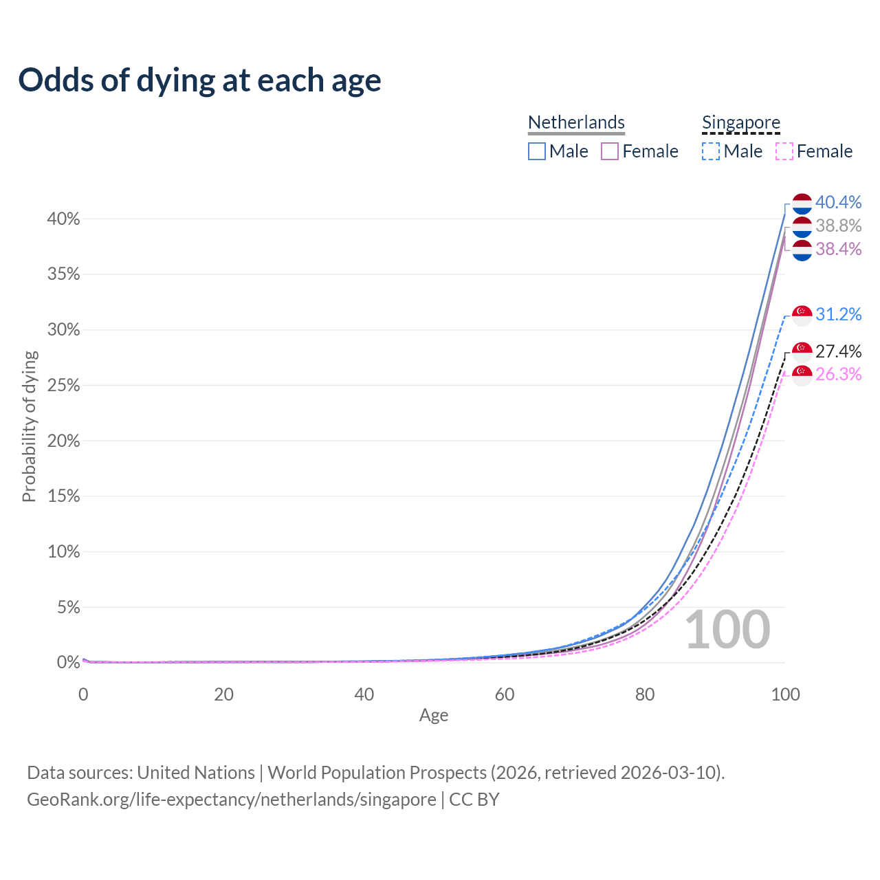 This life expectancy calculator shows the odds of living to 100, 95, 90, and below based on current age for both males and females in the Netherlands and Singapore, along with mean and median age of death. The calculations are based on the 2026 life tables (actuarial tables) from the UN World Population Prospects.