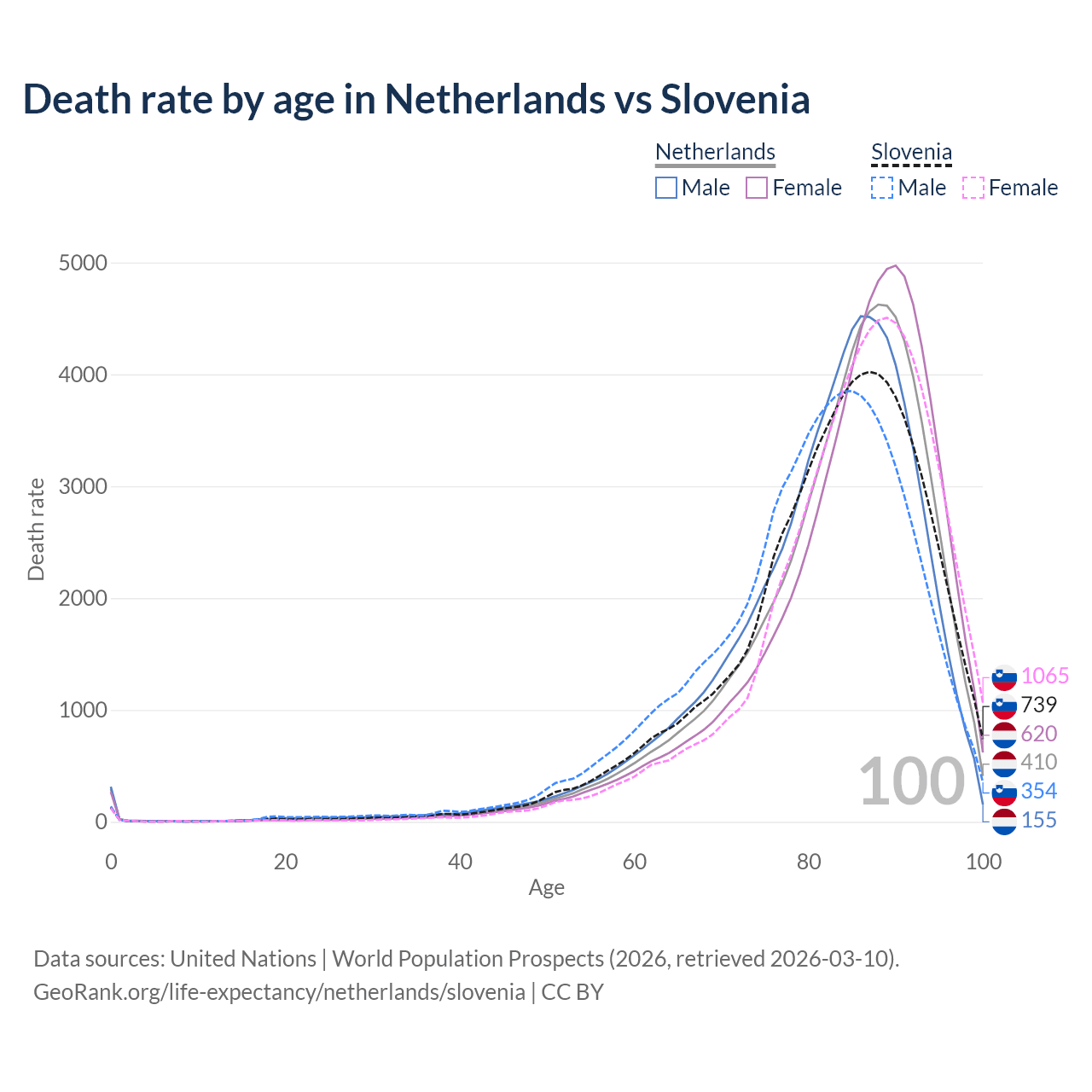 In the Netherlands, the most common age of death is 88, compared to 87 in Slovenia. The median age of death is 85.5 in the Netherlands and 84.4 in Slovenia, meaning only half of each cohort is expected to live past that age.