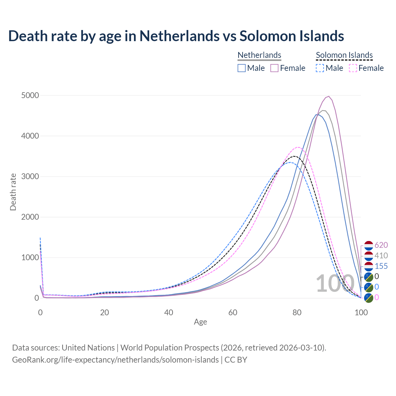 In the Netherlands, the most common age of death is 88, compared to 79 in the Solomon Islands. The median age of death is 85.5 in the Netherlands and 74.9 in the Solomon Islands, meaning only half of each cohort is expected to live past that age.