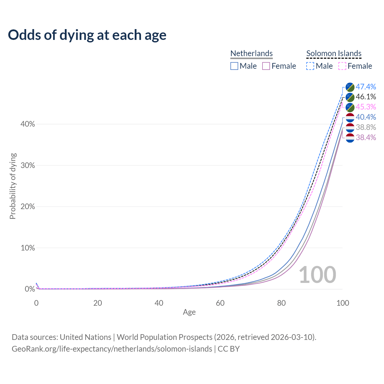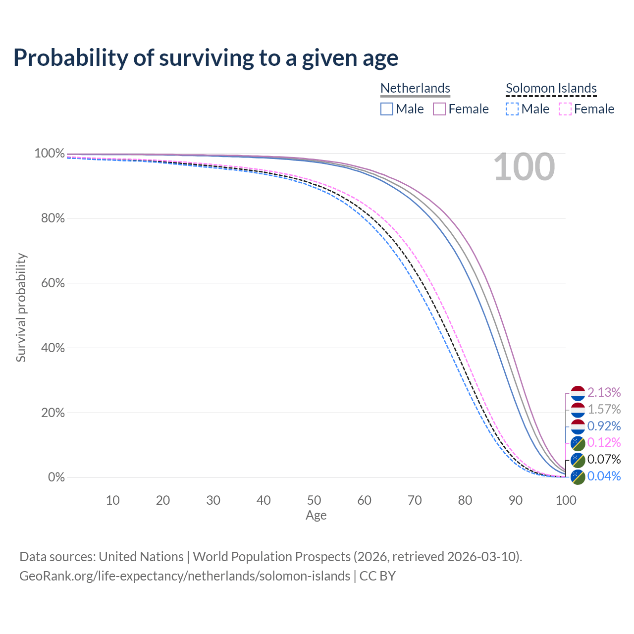 This life expectancy calculator shows the odds of living to 100, 95, 90, and below based on current age for both males and females in the Netherlands and the Solomon Islands, along with mean and median age of death. The calculations are based on the 2026 life tables (actuarial tables) from the UN World Population Prospects.