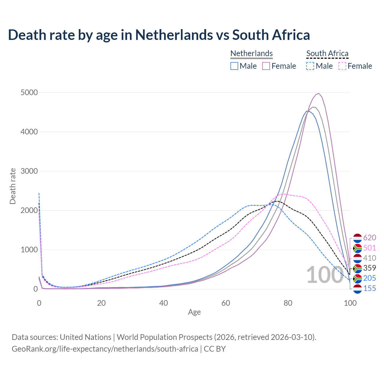 In the Netherlands, the most common age of death is 88, compared to 77 in South Africa. The median age of death is 85.5 in the Netherlands and 70.8 in South Africa, meaning only half of each cohort is expected to live past that age.