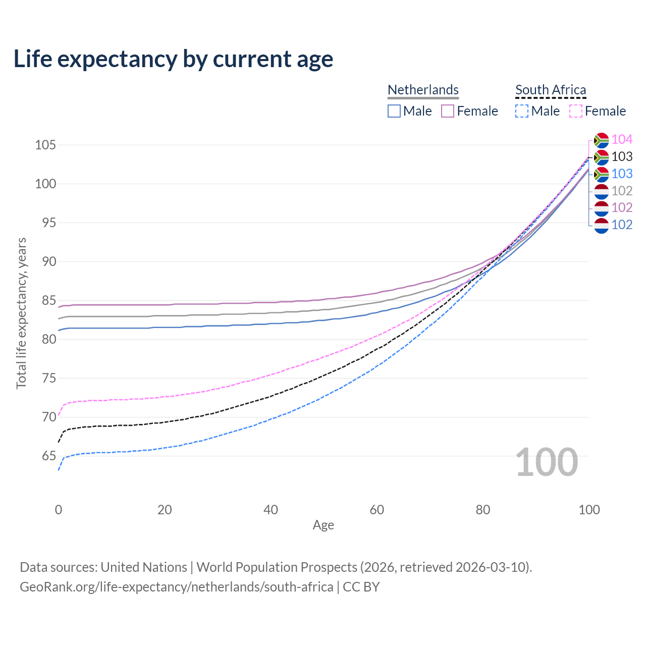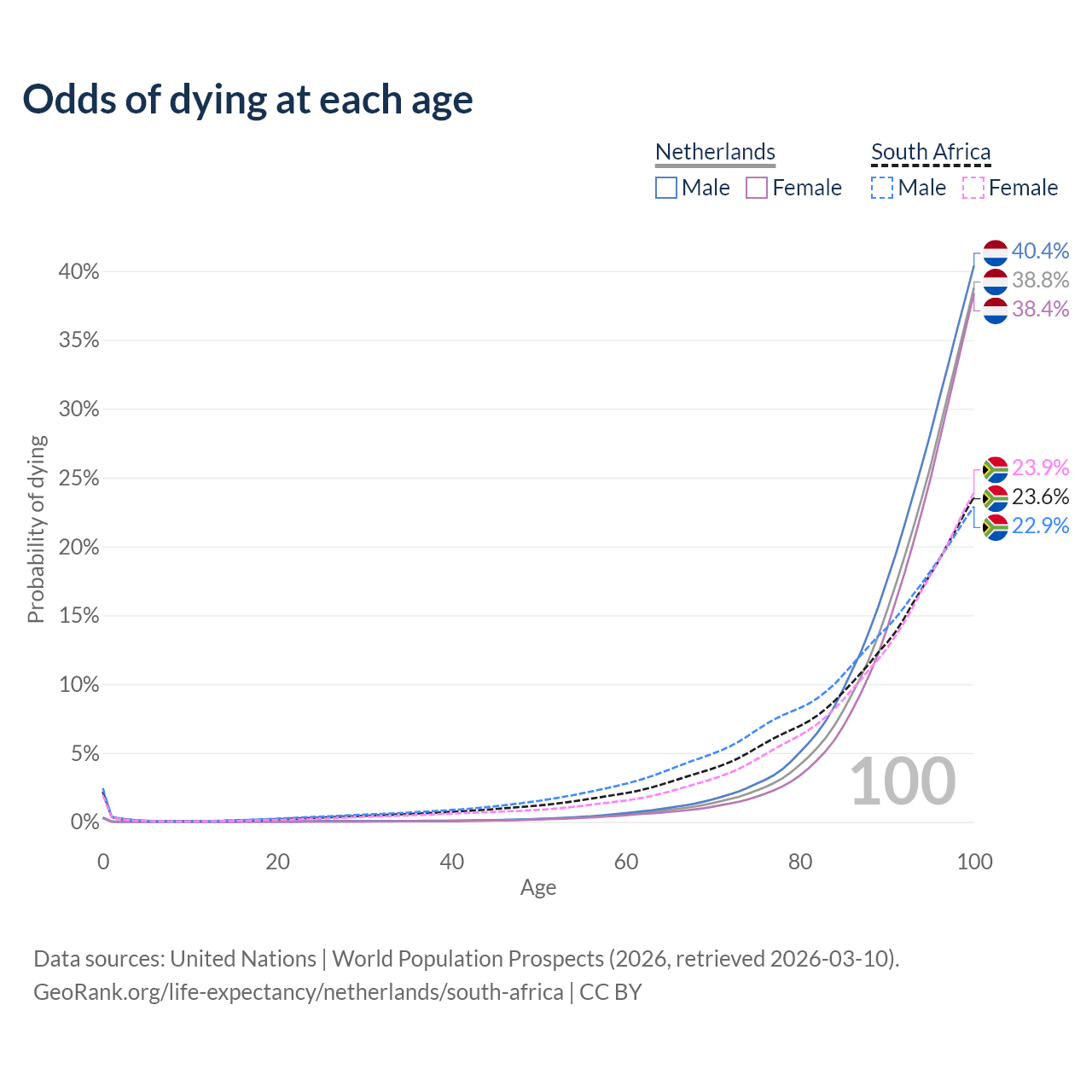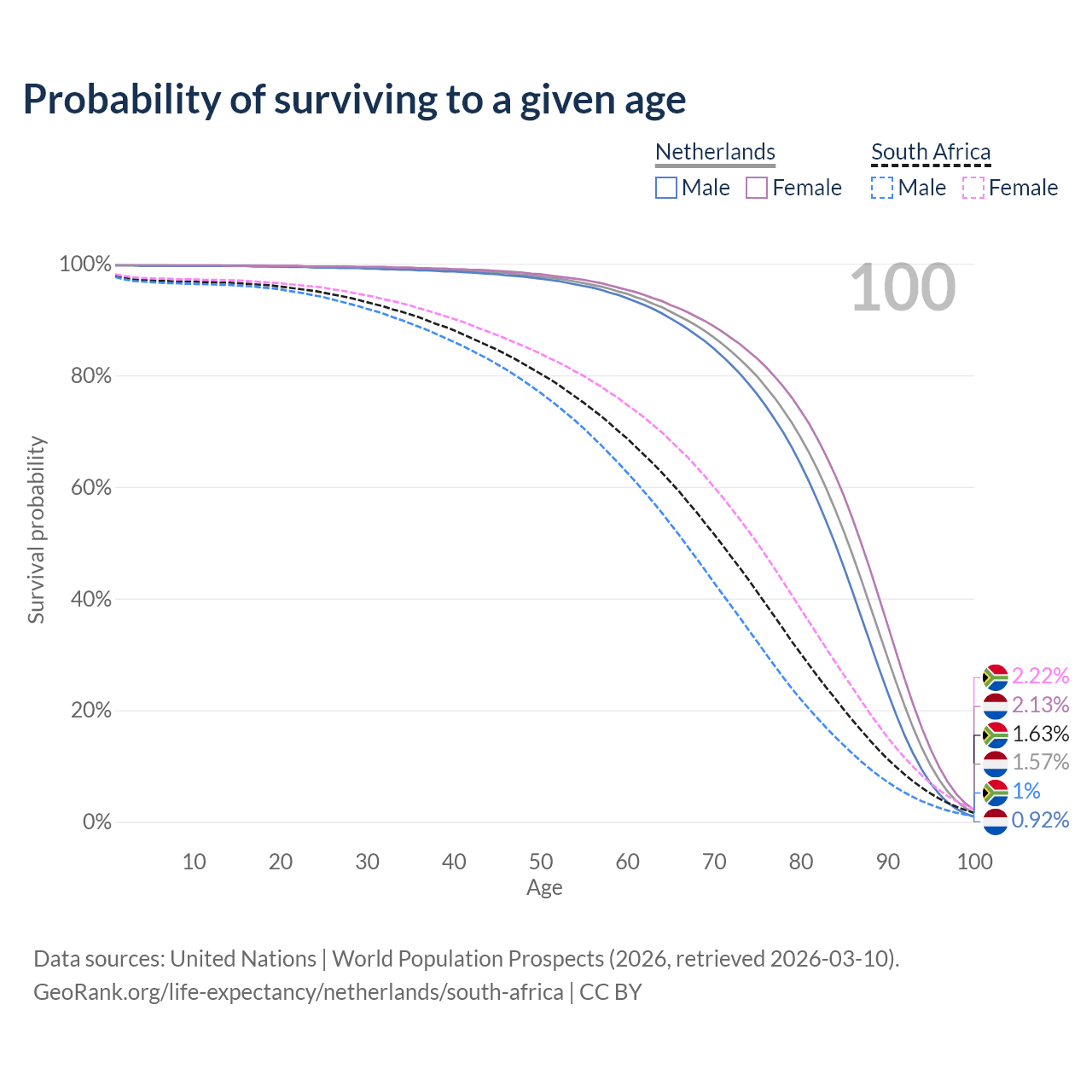 This life expectancy calculator shows the odds of living to 100, 95, 90, and below based on current age for both males and females in the Netherlands and South Africa, along with mean and median age of death. The calculations are based on the 2026 life tables (actuarial tables) from the UN World Population Prospects.