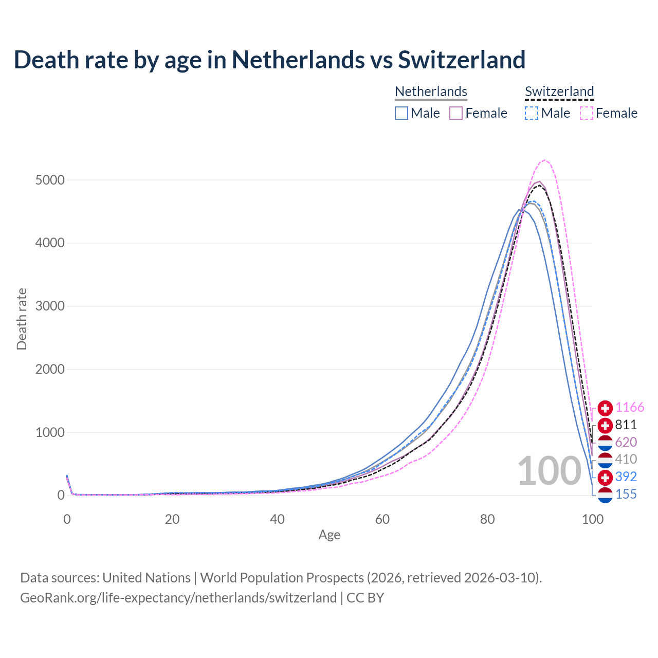 In the Netherlands, the most common age of death is 88, compared to 90 in Switzerland. The median age of death is 85.5 in the Netherlands and 87.2 in Switzerland, meaning only half of each cohort is expected to live past that age.