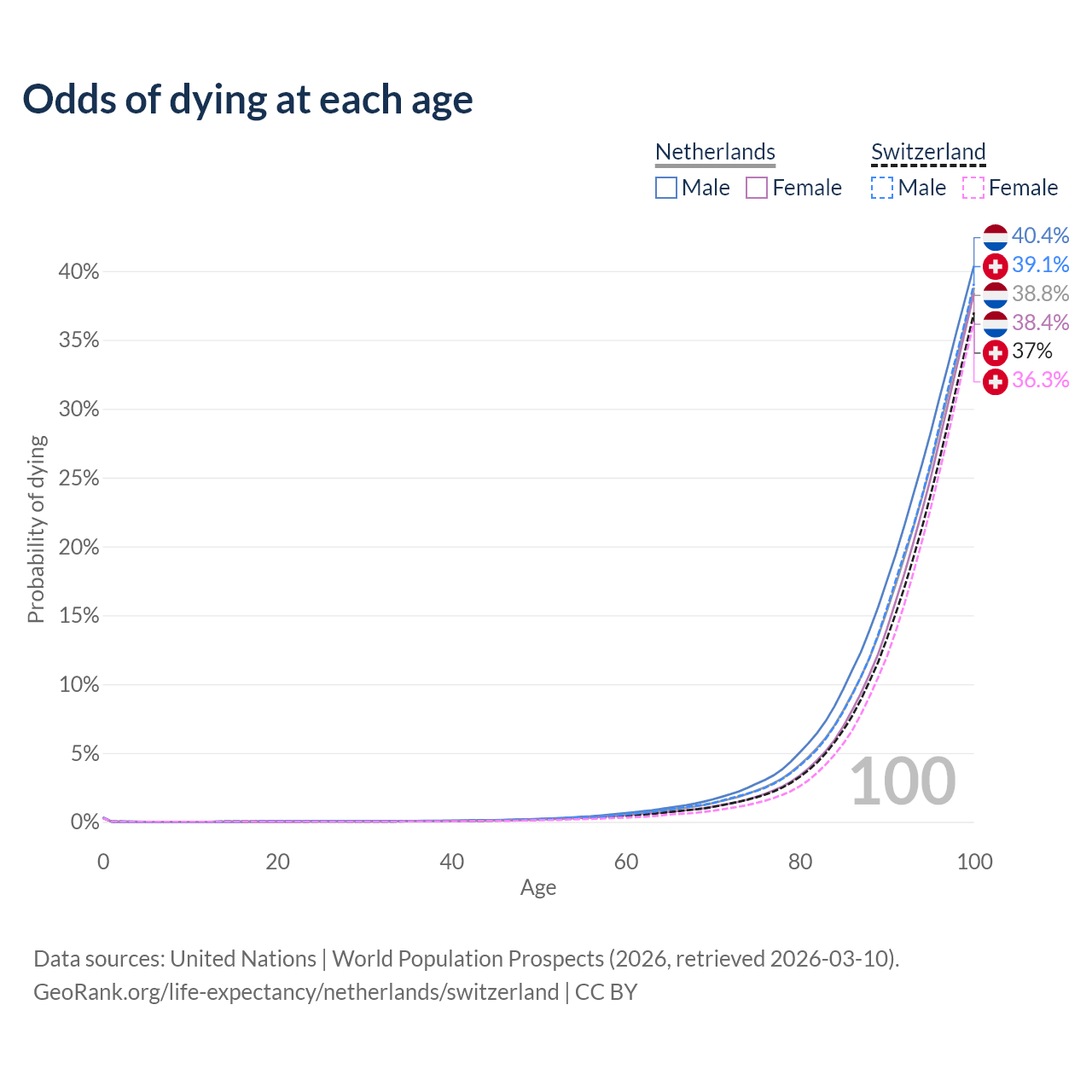 This life expectancy calculator shows the odds of living to 100, 95, 90, and below based on current age for both males and females in the Netherlands and Switzerland, along with mean and median age of death. The calculations are based on the 2026 life tables (actuarial tables) from the UN World Population Prospects.